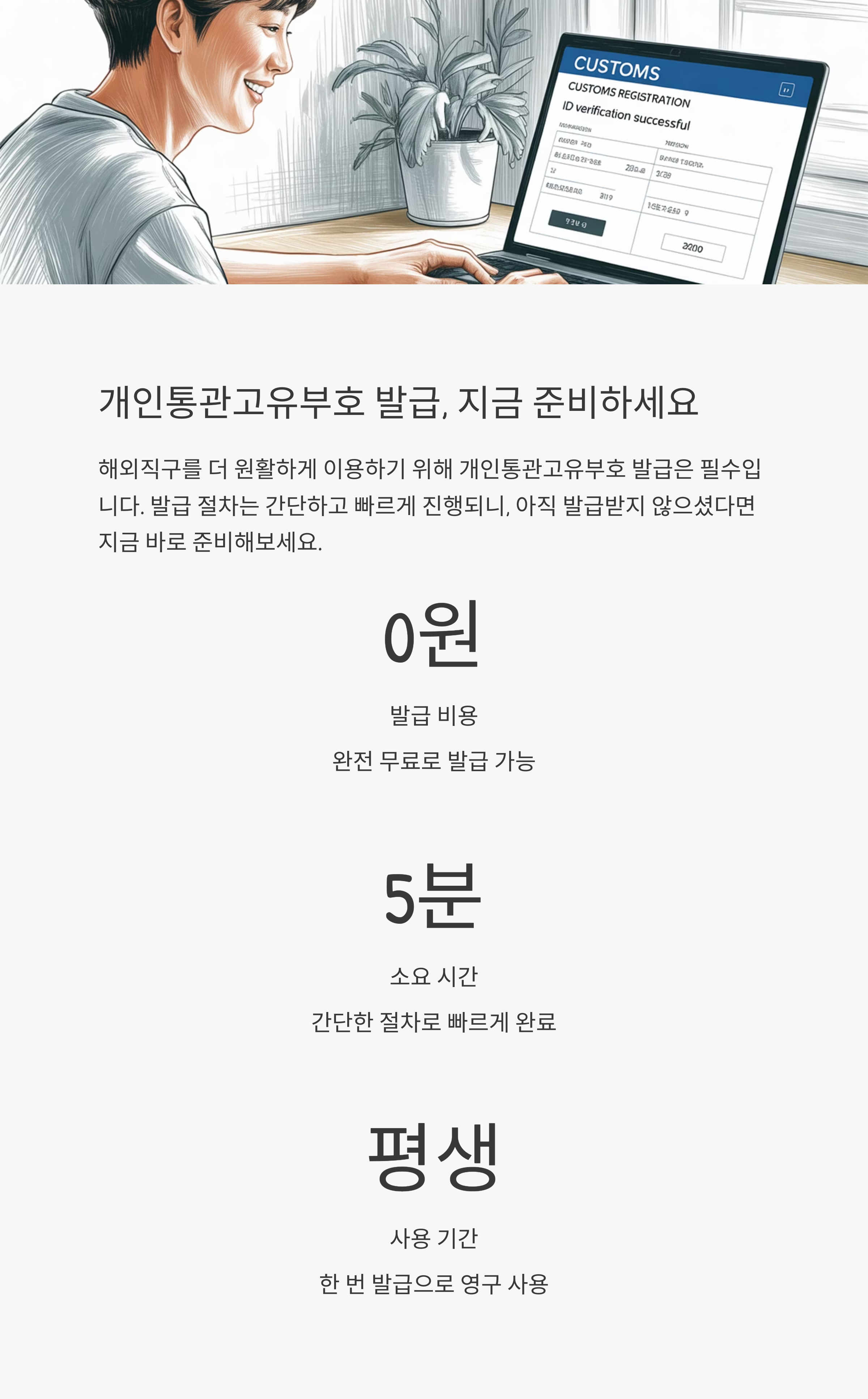 이 번호 하나로 해외직구의 통관 절차가 훨씬 수월해집니다. 게다가 한 번 발급받으면 평생 사용할 수 있어 번거롭게 재발급받을 필요도 없어요.