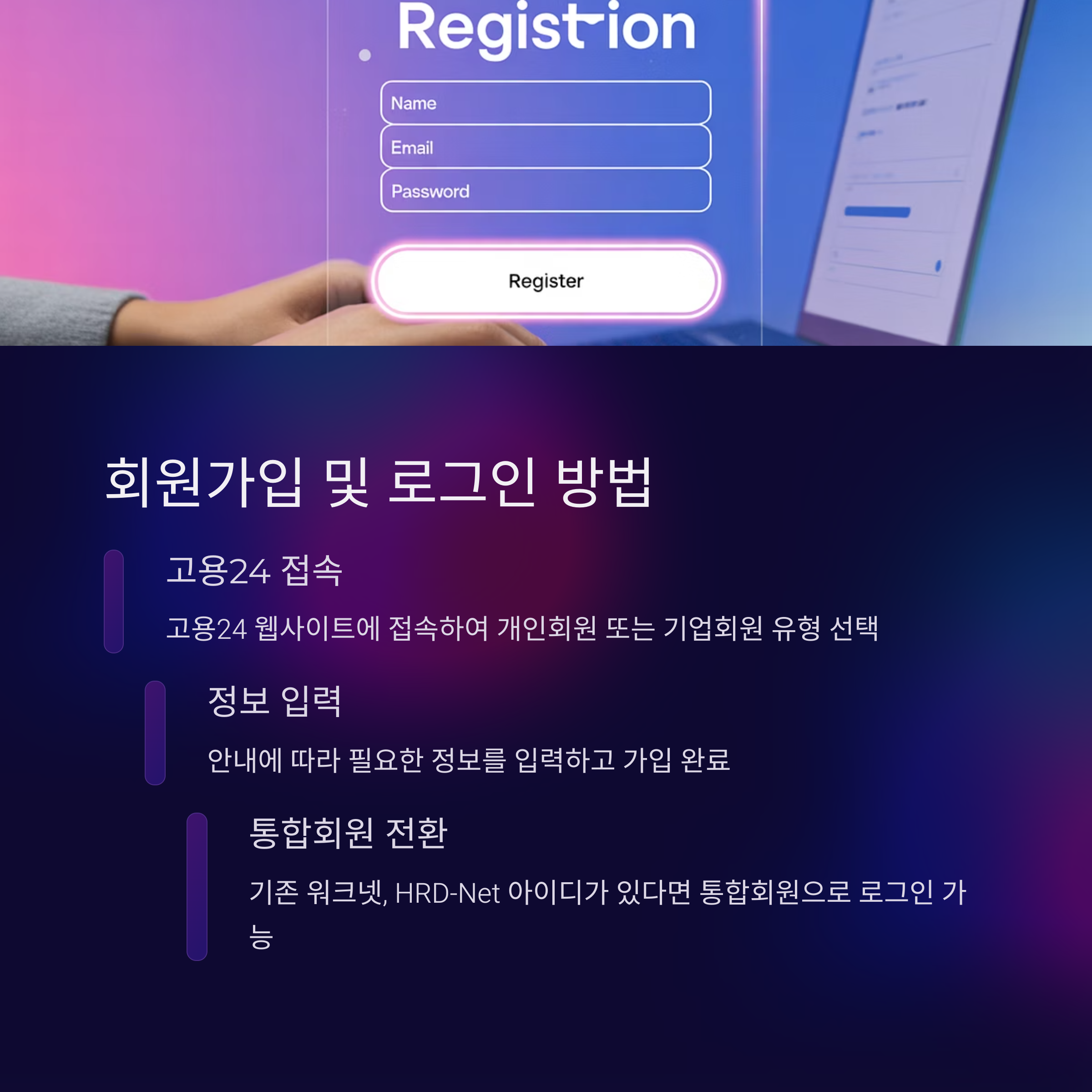 가장 먼저 고용24 웹사이트에 접속해서 회원가입을 진행해야 해요. 개인회원 또는 기업회원 유형을 선택하고, 안내에 따라 정보를 입력하면 간편하게 가입할 수 있습니다.