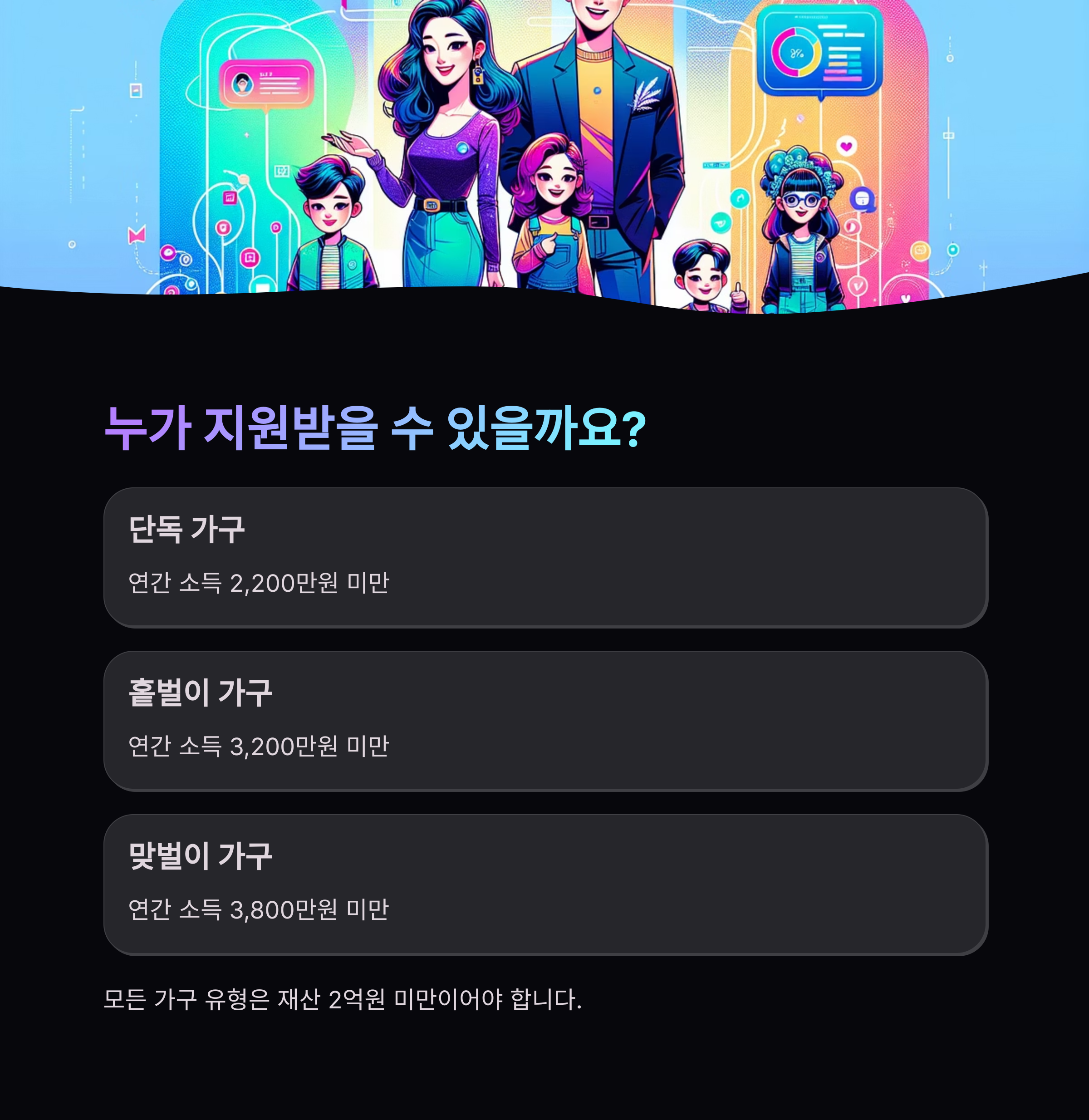 - 단독 가구: 연간 총소득이 2,200만원 미만