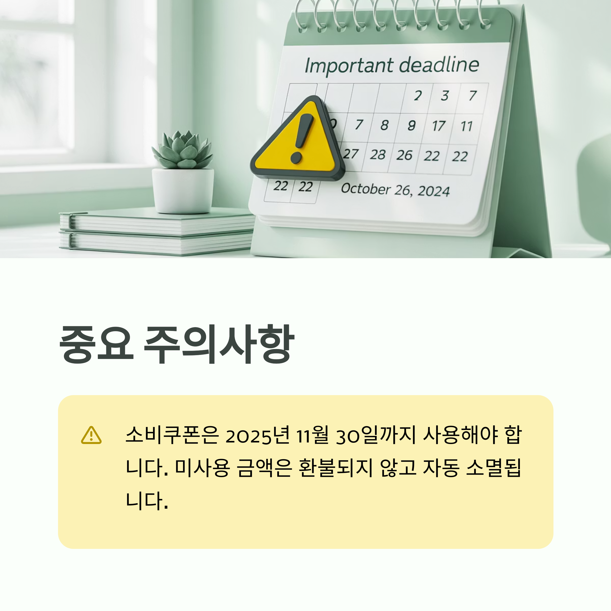 민생회복 소비쿠폰은 2025년 11월 30일까지 사용해야 하며, 사용하지 않고 남은 금액은 환불되지 않고 자동 소멸됩니다.