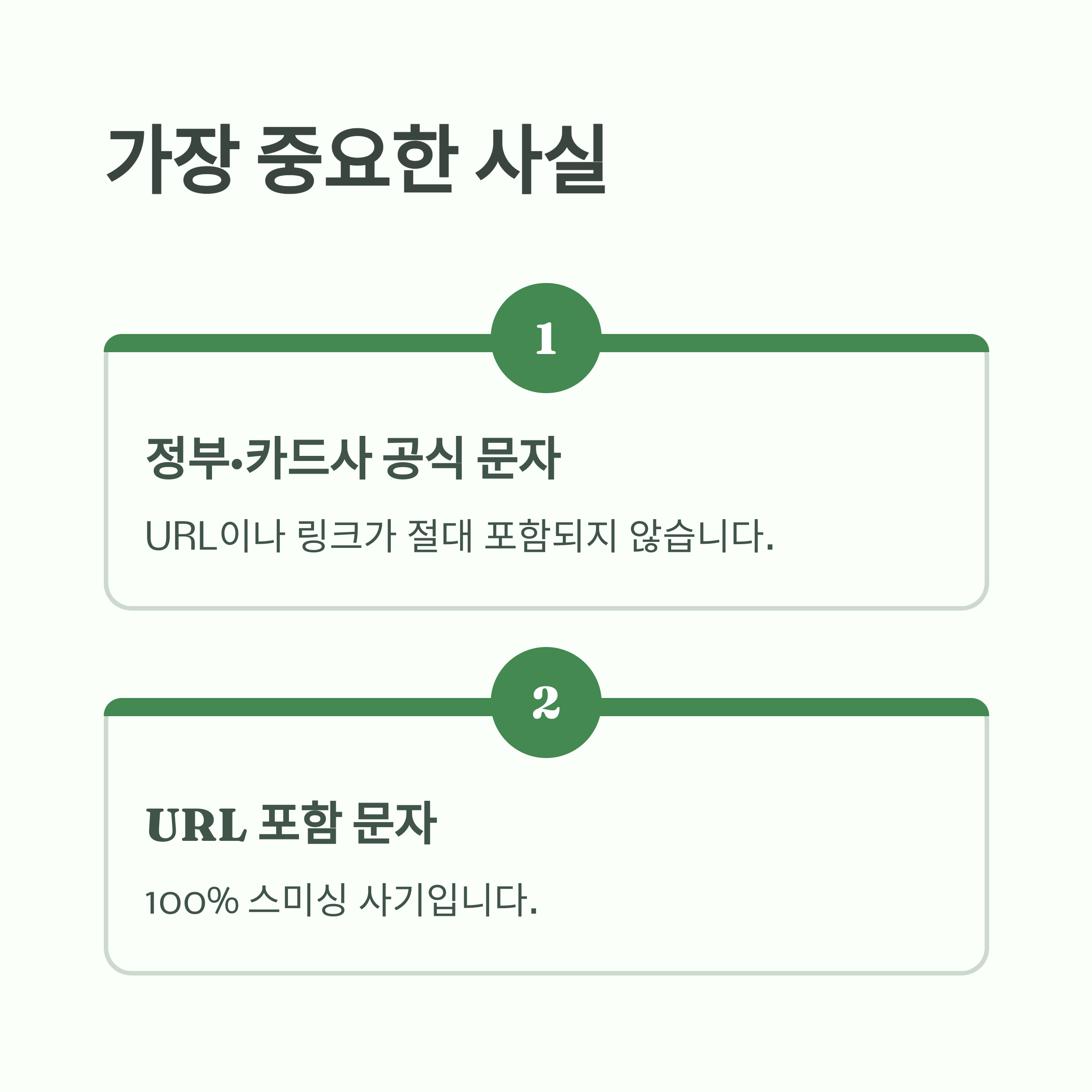- URL 포함 문자는 100% 사기입니다. 정부나 카드사는 절대 링크가 포함된 문자를 발송하지 않습니다.