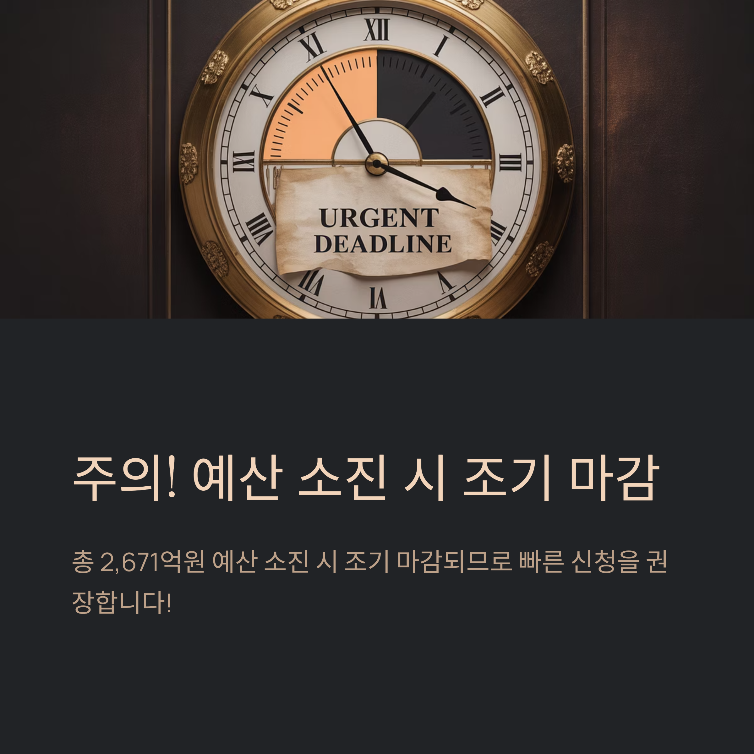 - 예산 소진 시 조기 마감. 선착순이므로 빠른 신청이 유리합니다.