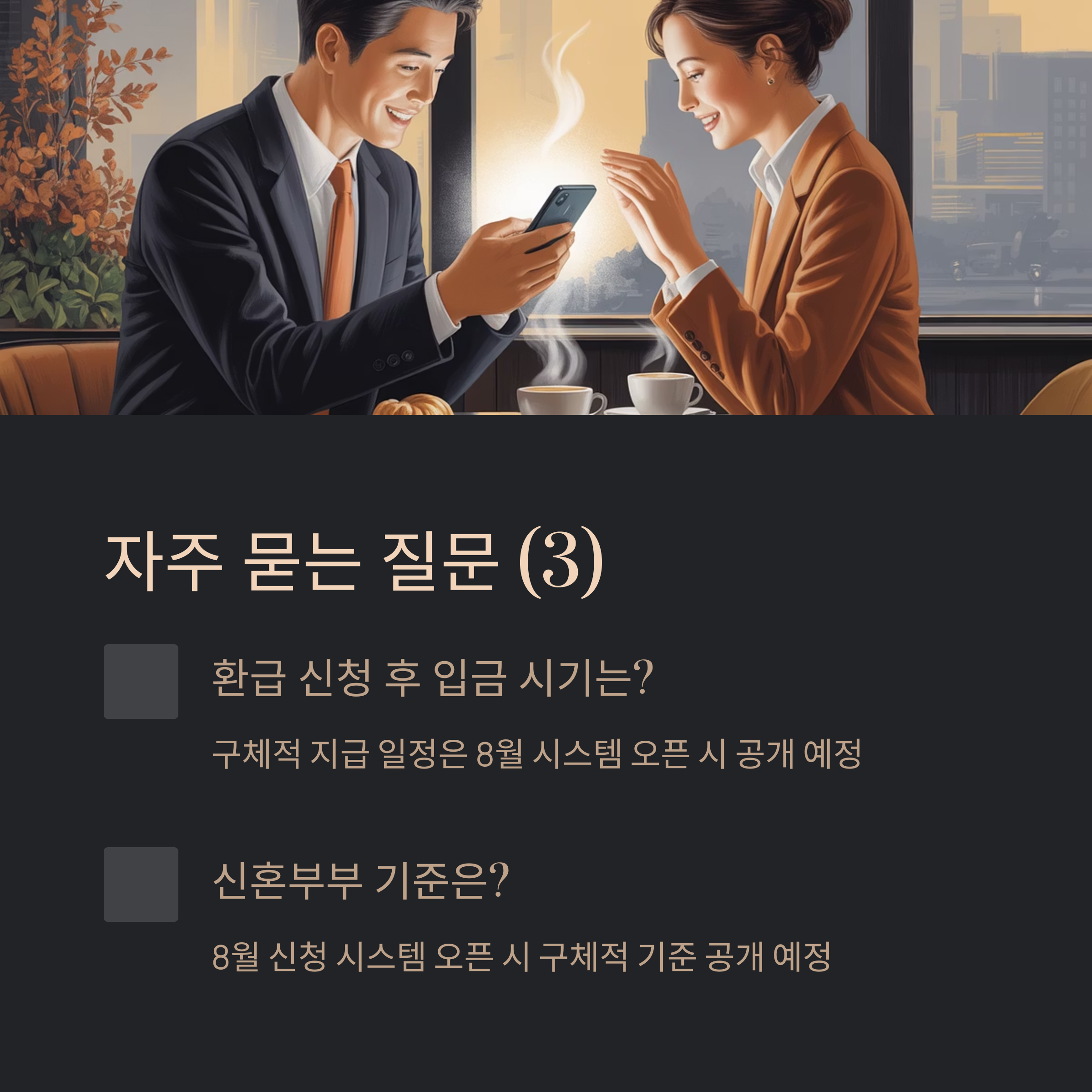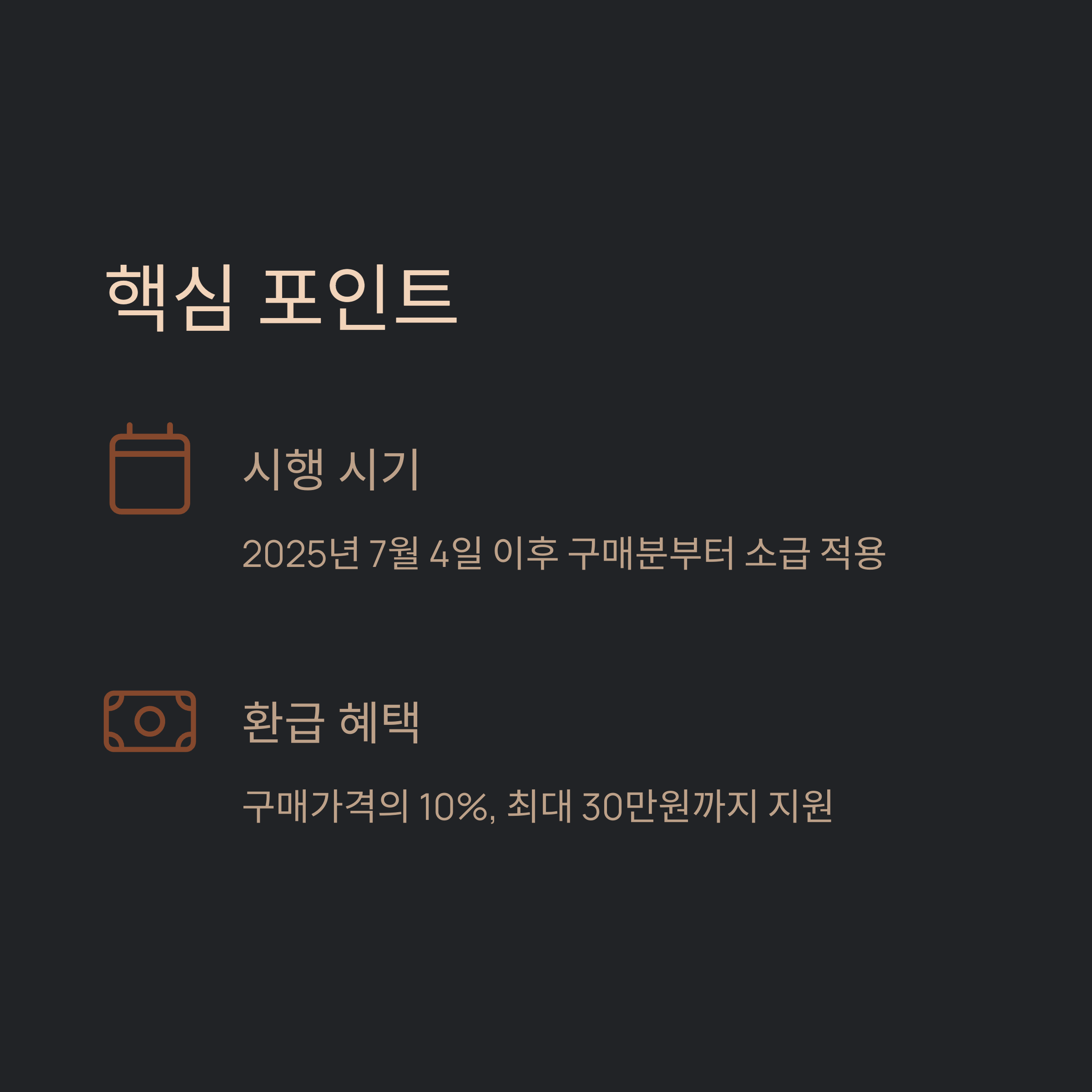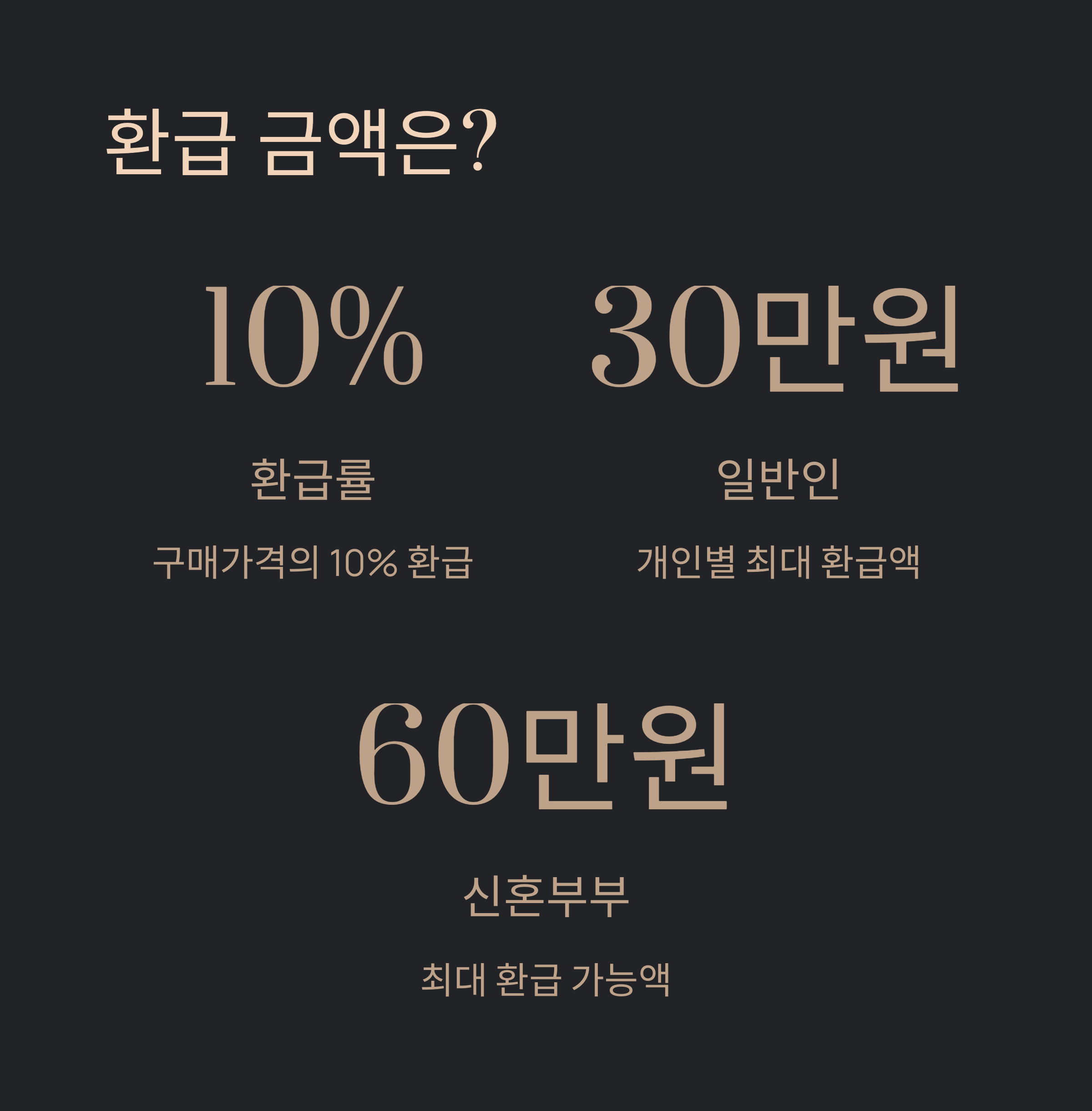 환급 금액은 구매가격의 10%이며, 개인별 최대 30만원까지 지원됩니다. 특히 신혼부부의 경우 최대 60만원까지 환급받을 수 있다고 하는데, 신혼부부 기준에 대한 구체적인 내용은 8월 신청 시스템 오픈 시 공개될 예정입니다.