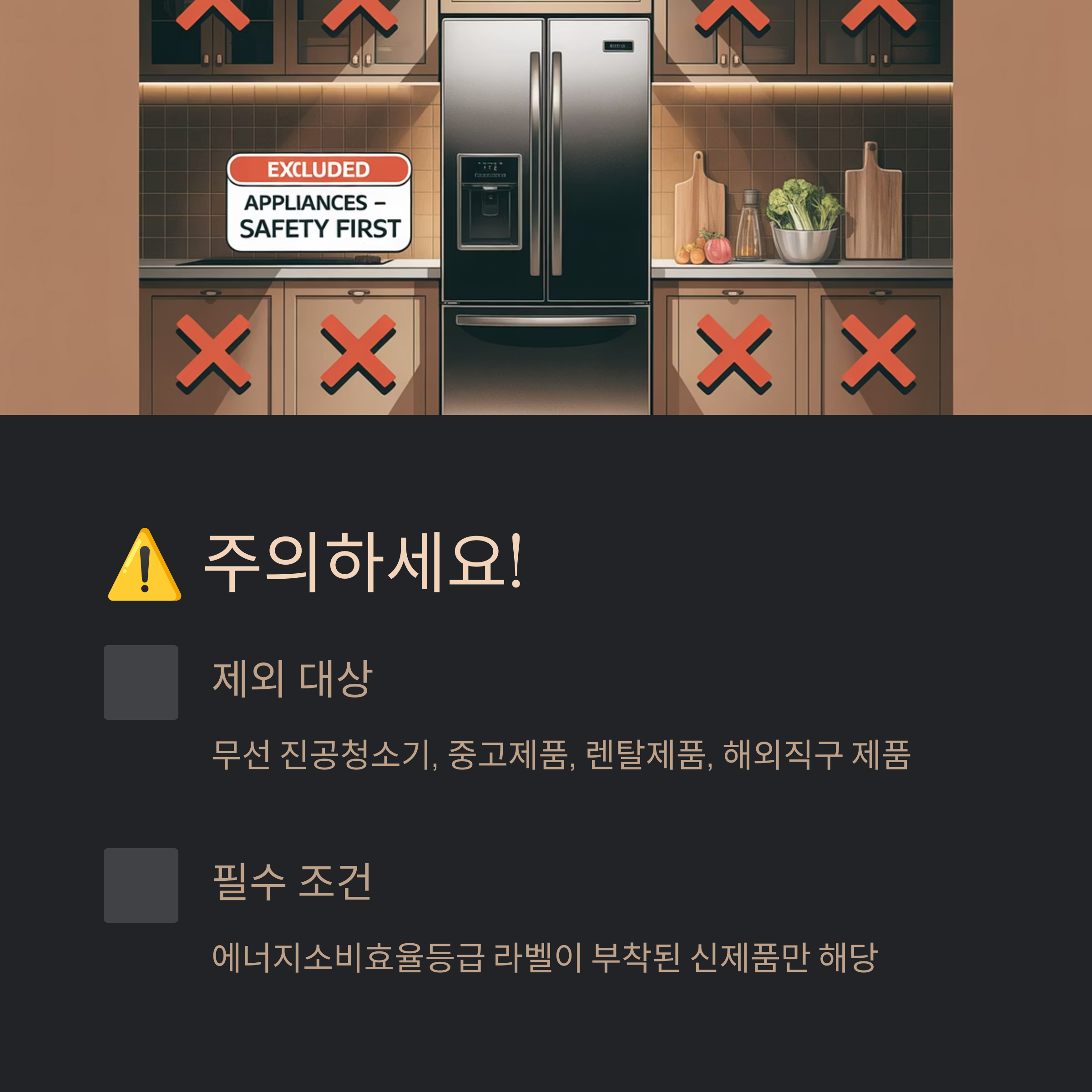 무선 진공청소기, 중고제품, 렌탈제품, 해외직구 제품은 환급 대상에서 제외됩니다. 반드시 에너지소비효율등급 라벨이 부착된 신제품이어야 합니다.