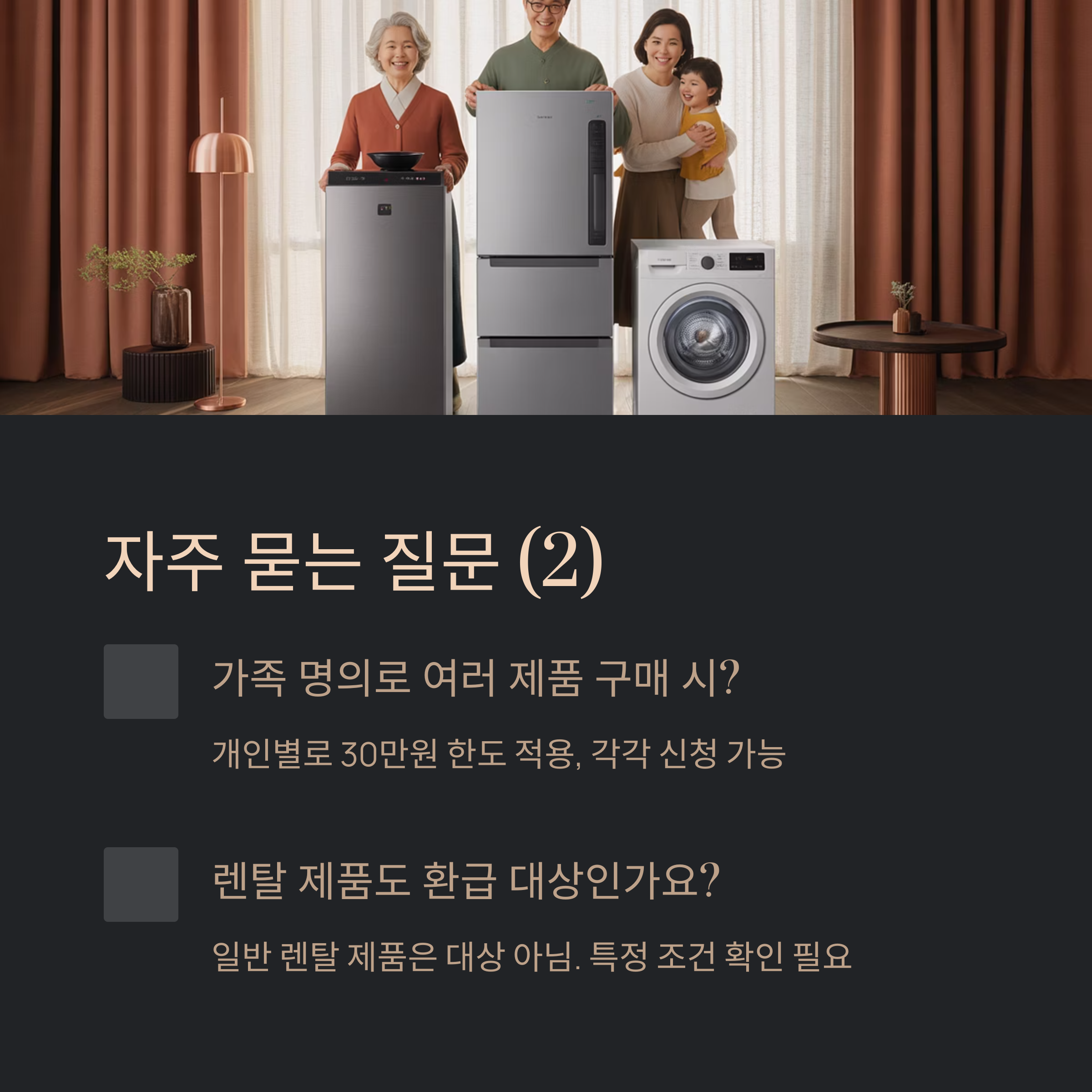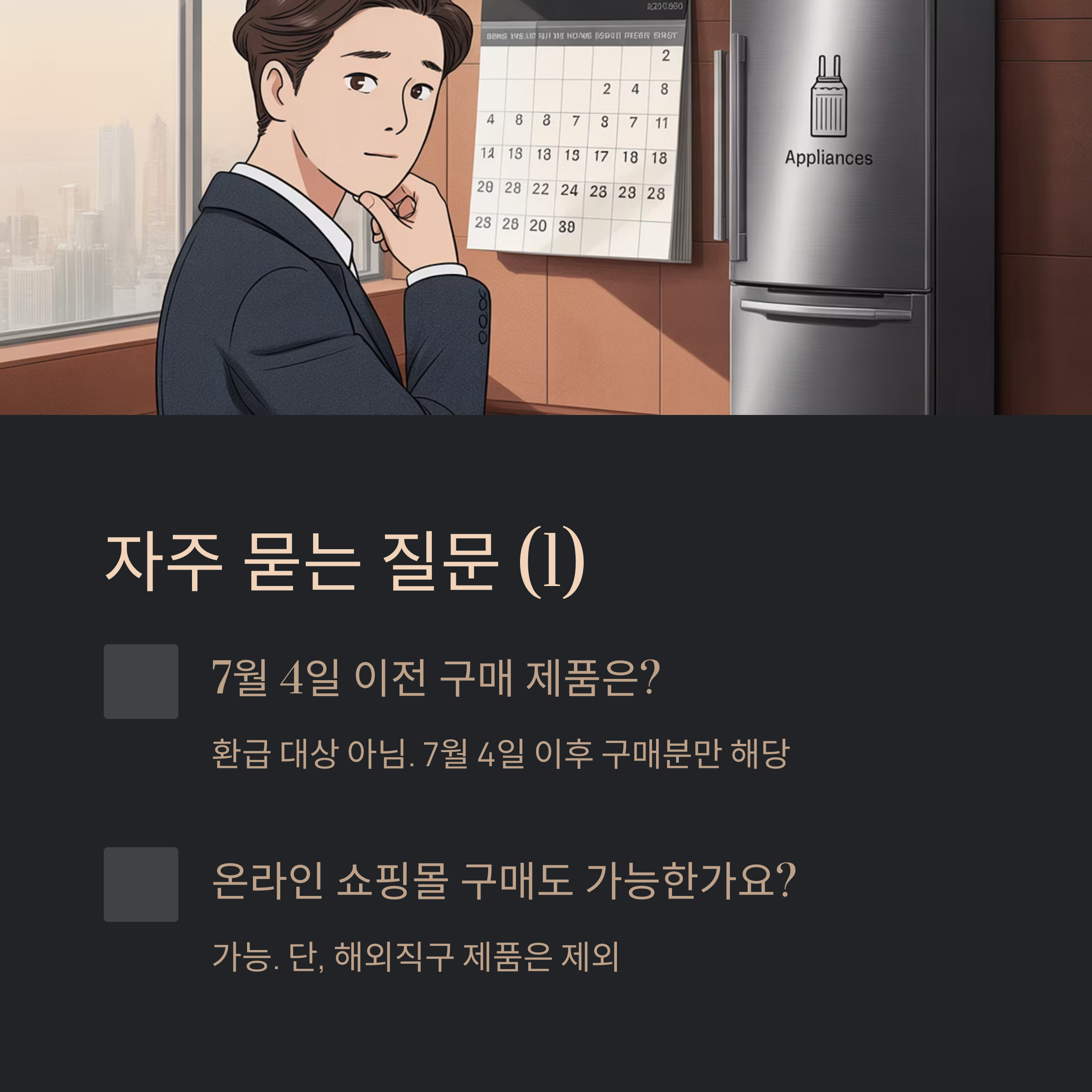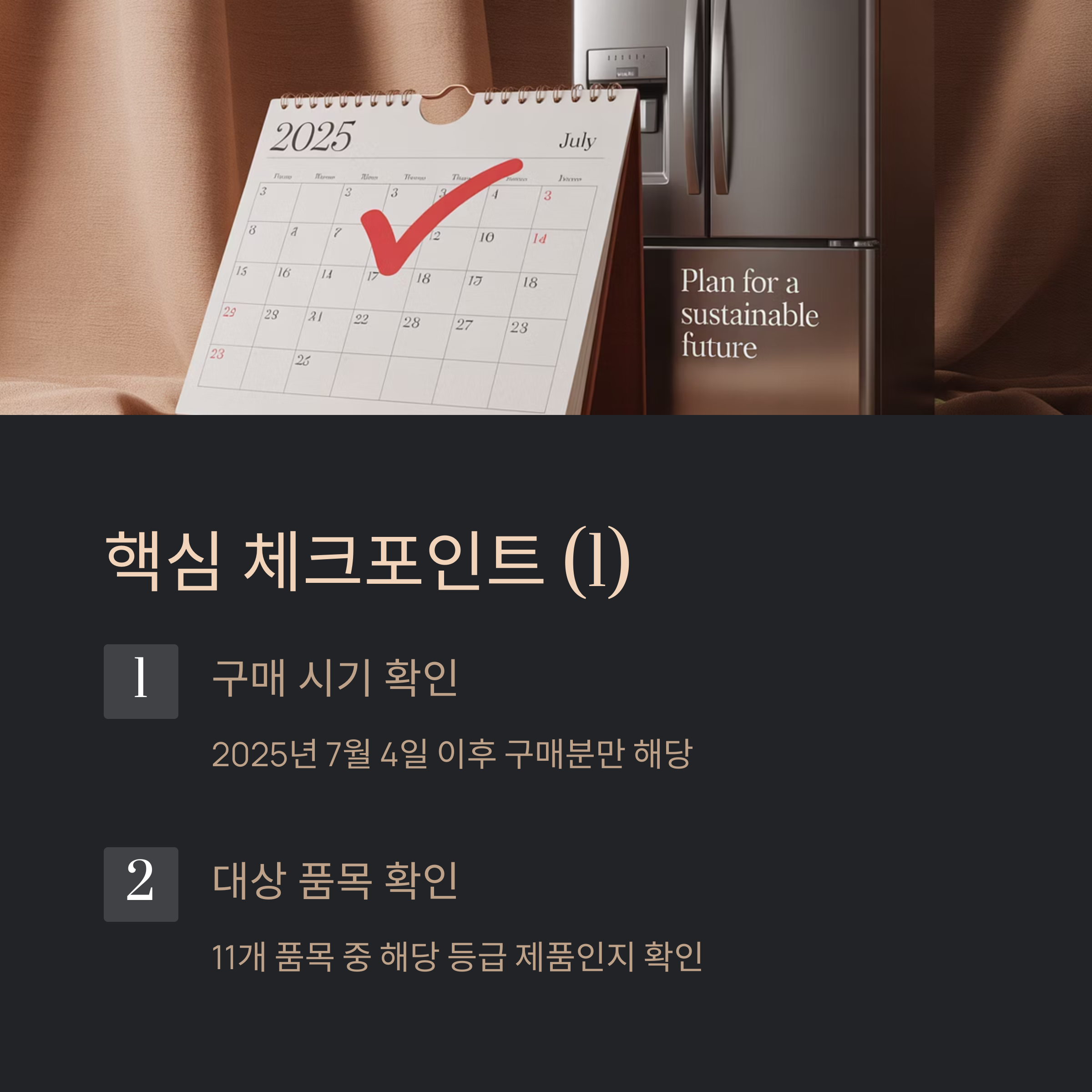 2025년 7월 4일부터 시행되었으며, 7월 4일 이후 구매분부터 소급 적용됩니다. 즉, 이미 7월에 고효율 가전을 구매하신 분들도 환급 신청이 가능합니다.
