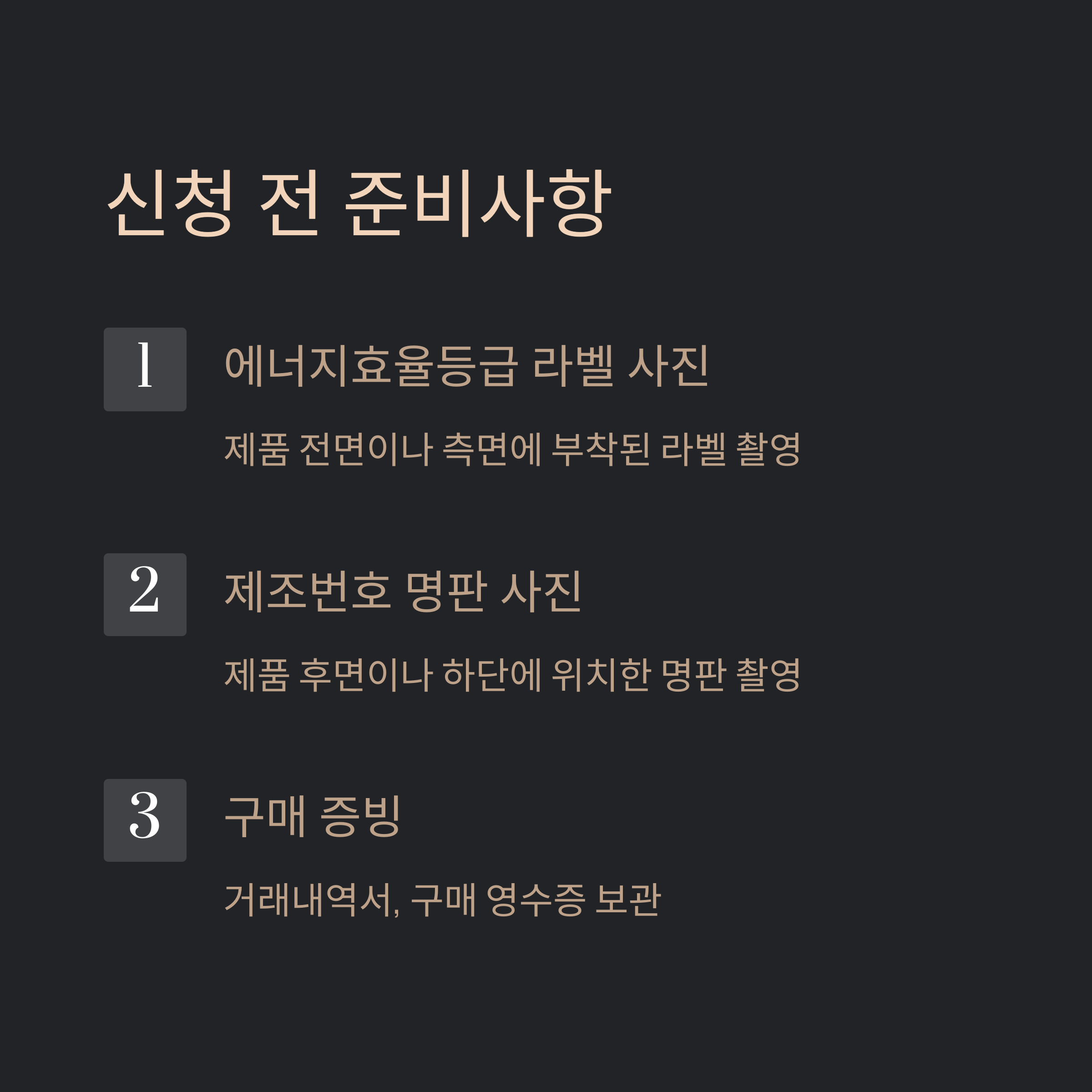 필수 서류: 에너지효율등급 라벨 사진, 제조번호 명판 사진, 거래내역서, 구매 영수증