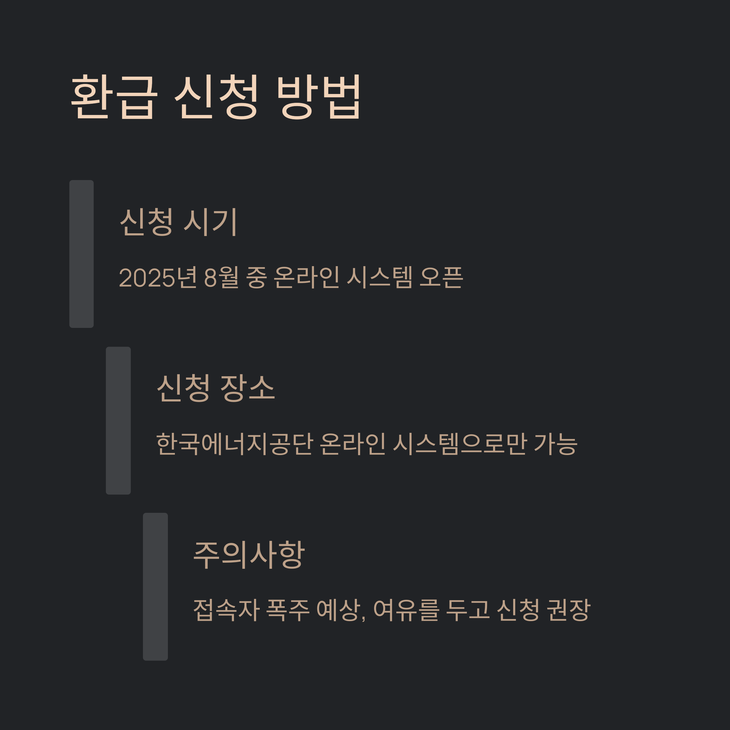 환급 신청은 2025년 8월 중 한국에너지공단에서 온라인 시스템을 통해서만 가능합니다. 제가 이런 정부 지원제도를 여러 번 경험해본 결과, 시스템 오픈 초기에는 접속자가 몰려 불편할 수 있으니 여유를 두고 신청하시기 바랍니다.