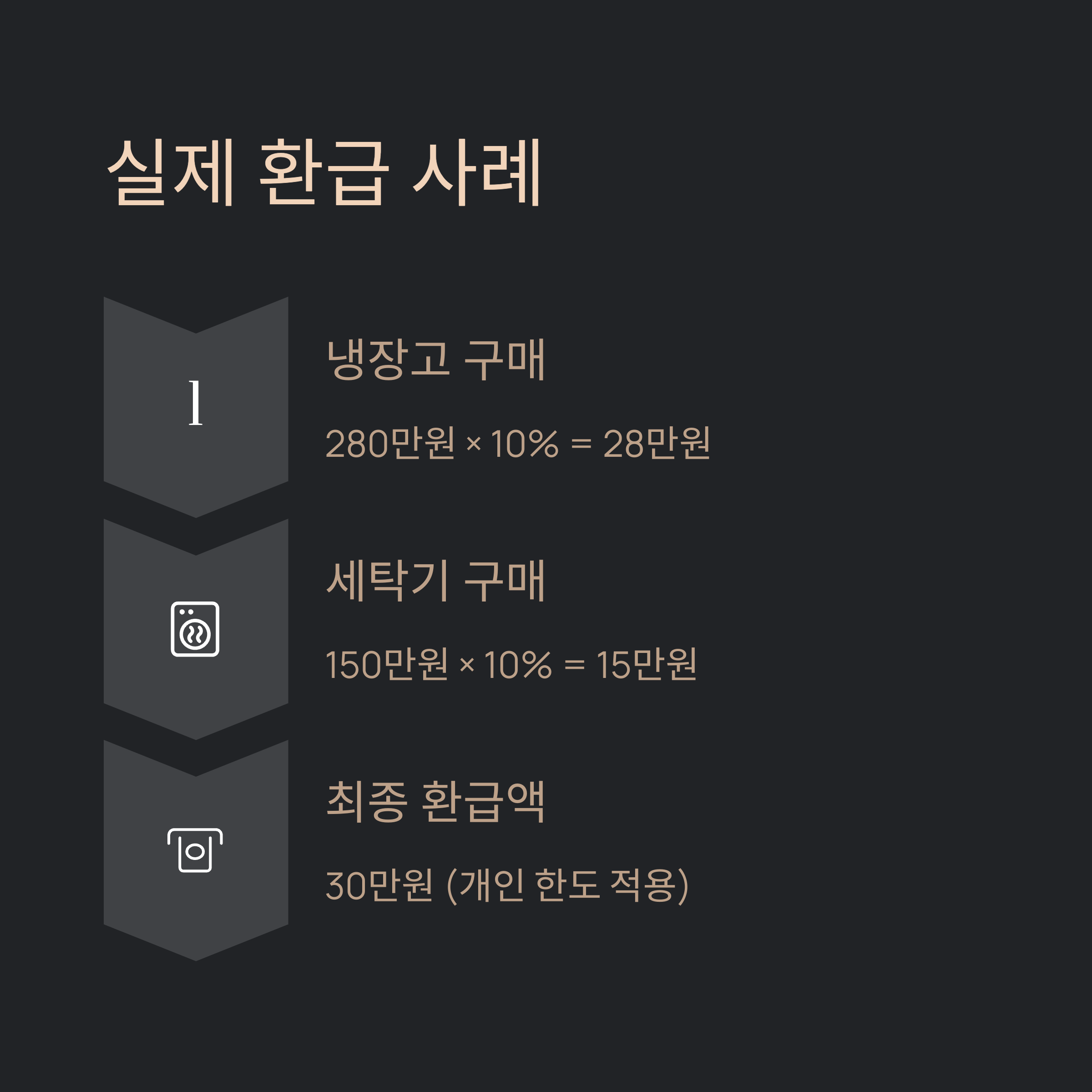 이처럼 여러 제품을 구매하더라도 개인별 최대 한도인 30만원까지만 환급받을 수 있다는 점을 기억하시기 바랍니다. 하지만 그럼에도 30만원이라는 금액은 상당한 혜택이라고 볼 수 있습니다.