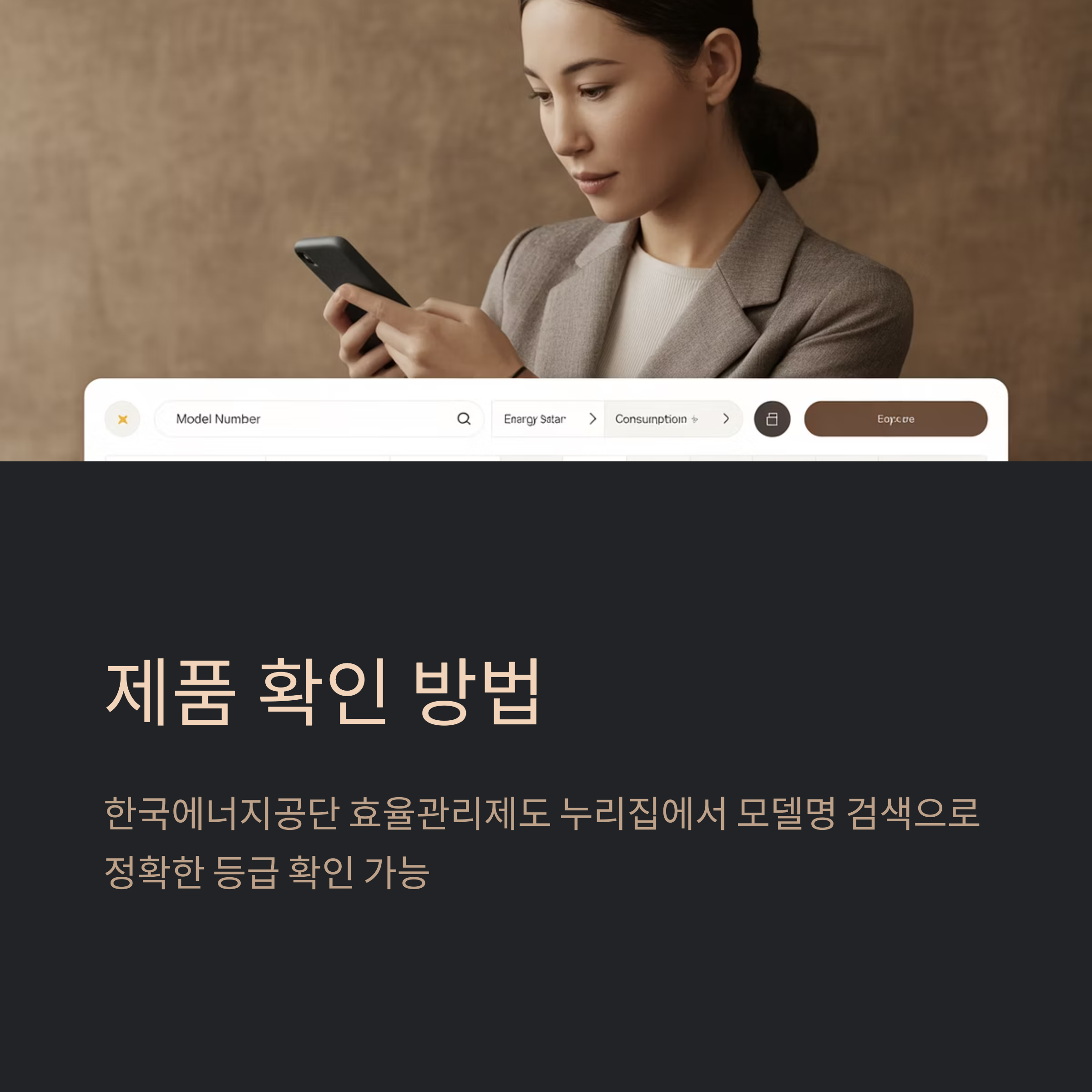 한국에너지공단 효율관리제도 누리집(https://eep.energy.or.kr/)에서 모델명을 검색하면 정확한 에너지효율 등급과 환급 대상 여부를 확인할 수 있습니다. 다만 간혹 검색 결과와 실제 부착된 라벨이 다를 수 있으니, 최종 판단은 실물 라벨을 기준으로 하시기 바랍니다.