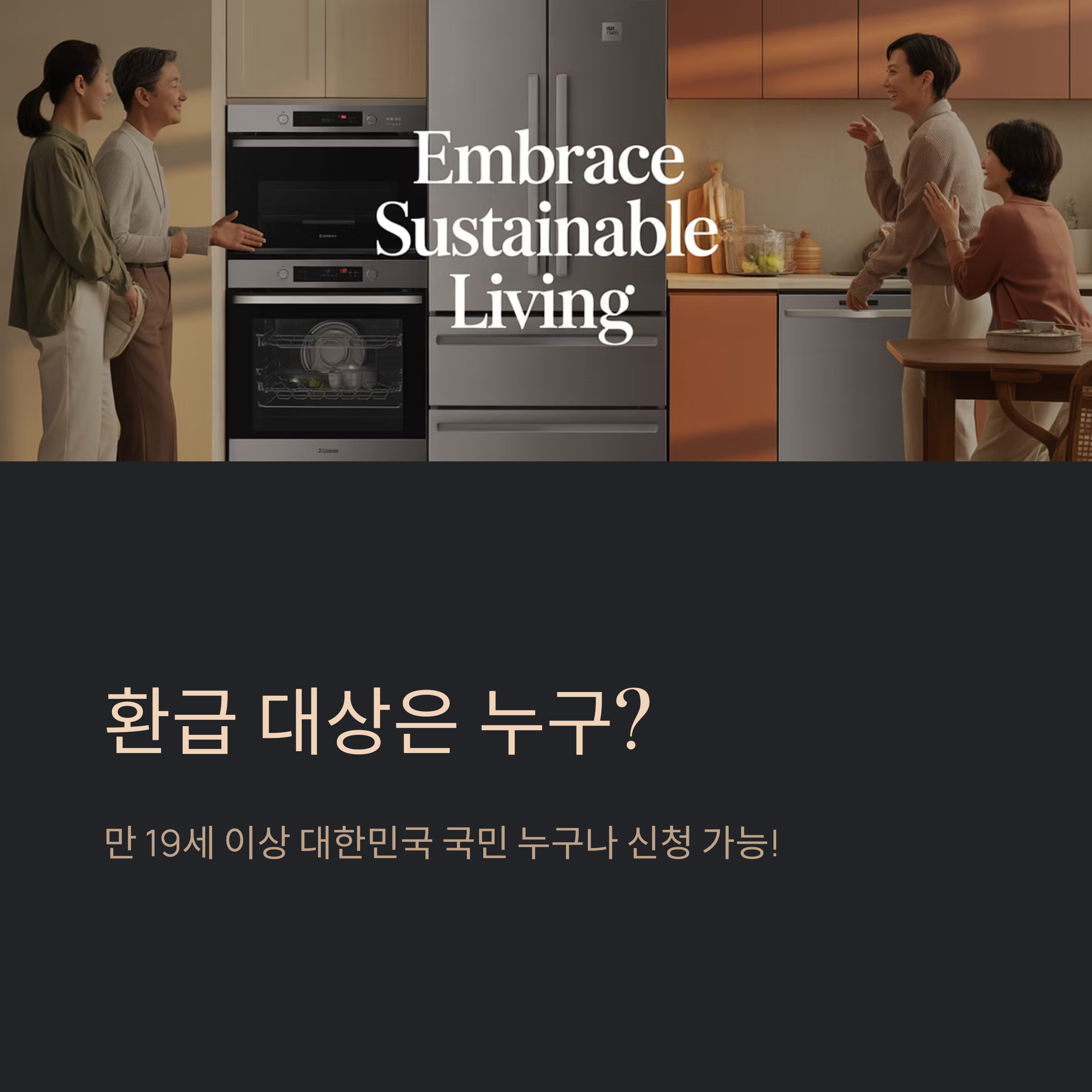 환급 대상은 만 19세 이상 대한민국 국민이면 누구나 신청할 수 있습니다. 기존 한전에서 진행했던 복지할인가구 대상 사업과는 달리, 이번에는 소득이나 가구 형태에 관계없이 전 국민이 대상입니다.