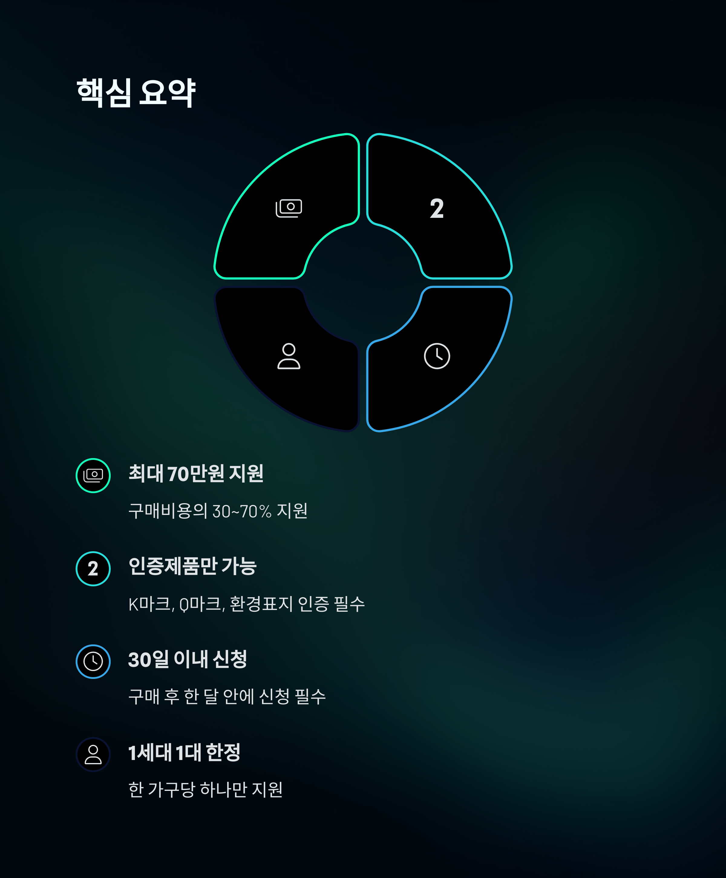 지원금은 일반적으로 1세대당 1대만 신청 가능하며, 구매일로부터 30일 이내에 신청해야 합니다. 또한 인증받은 제품만 지원 대상이므로 구매 전 반드시 확인하세요.