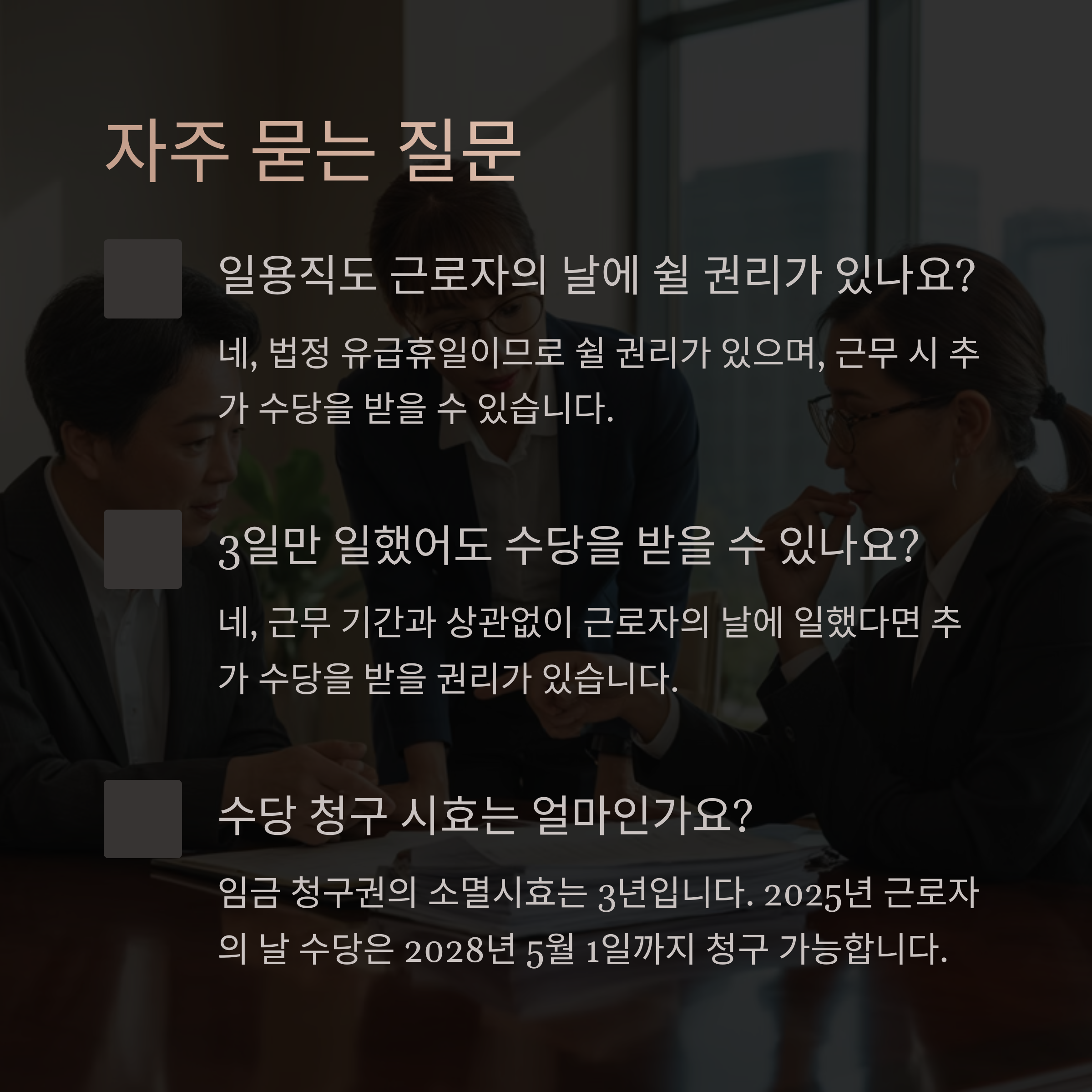 A: 임금 청구권의 소멸시효는 3년입니다. 따라서 근로자의 날 수당도 근무일로부터 3년 이내에 청구해야 합니다. 2025년 근로자의 날에 일한 경우 2028년 5월 1일까지 청구 가능합니다. 기간이 지나면 법적으로 청구할 수 없으니 주의하세요.