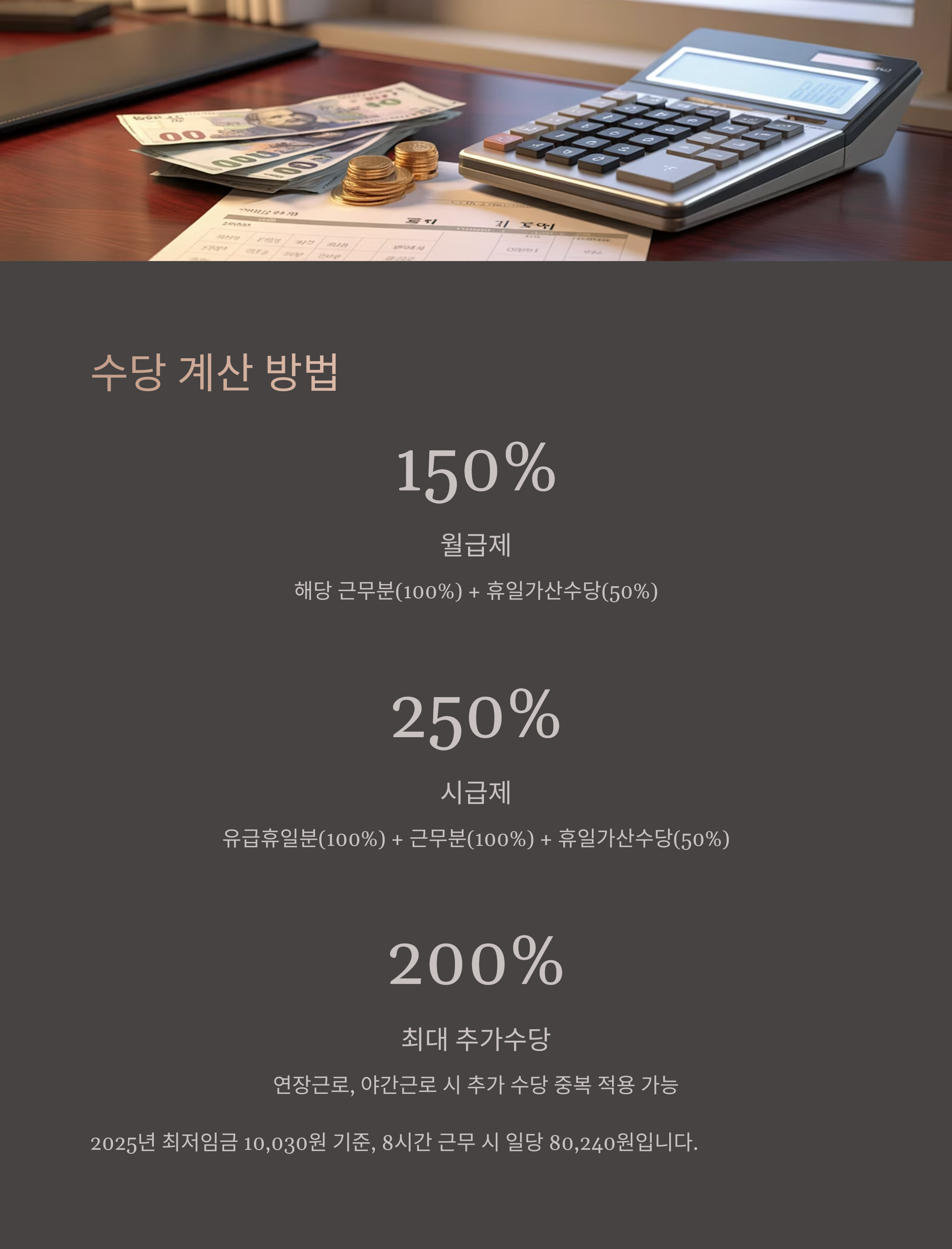 - 시급제 일용직 근로자: 유급휴일 분(100%) + 해당 근무분(100%) + 휴일가산수당(50%) = 수당의 250% 지급