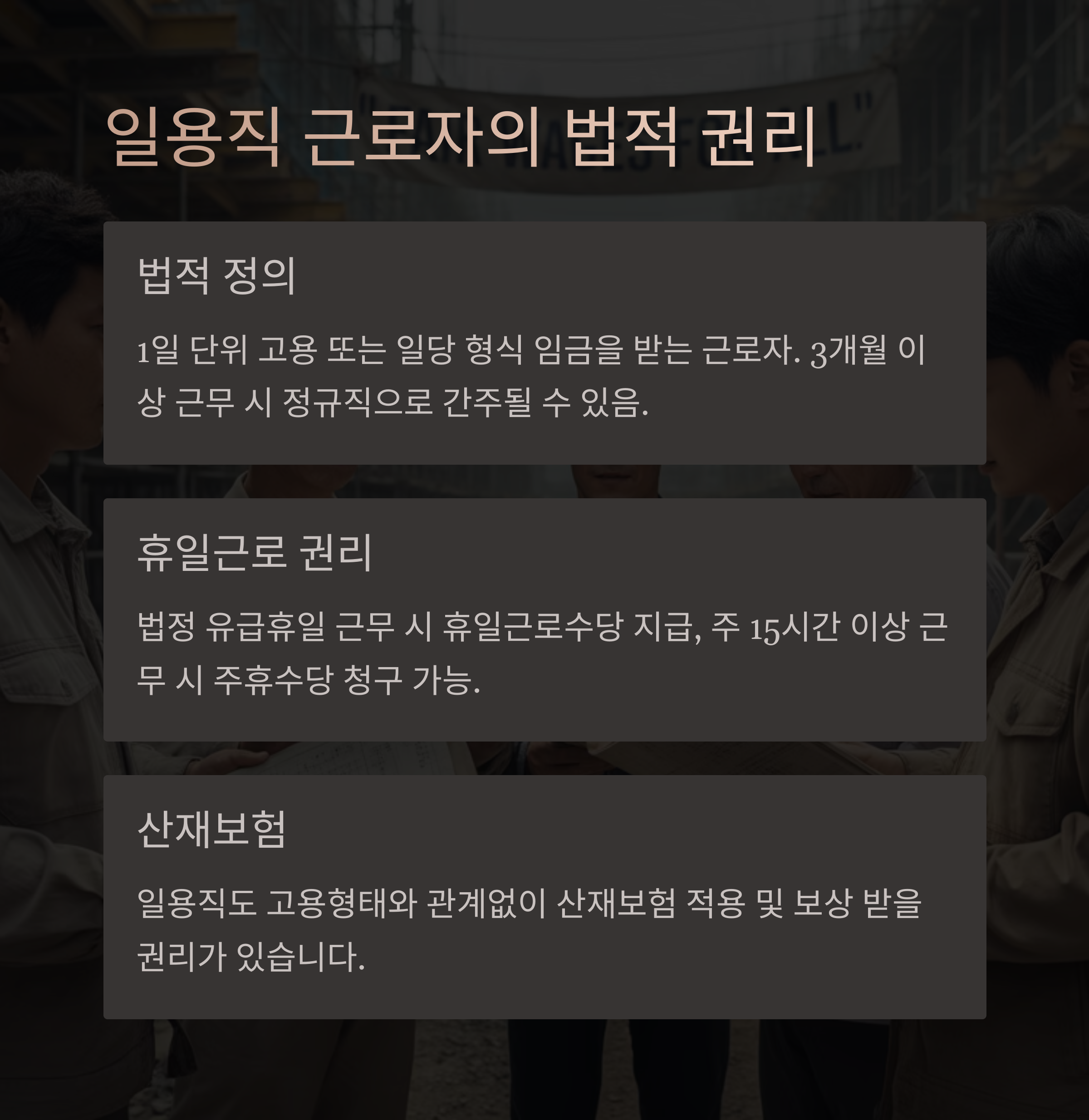 근로기준법상 일용직 근로자는 1일 단위로 고용되거나 근로일에 따라 일당 형식의 임금을 지급받는 근로자를 의미합니다. 그러나 동일한 사업장에서 3개월 이상 계속 근무하거나 근로 형태가 상용근로자와 비슷하다고 인정되는 경우에는 일용직이 아닌 정규직으로 간주될 수 있으니 이점을 유의하세요. 일용직 근로자의 날 근무수당도 이러한 법적 지위에 따라 달라질 수 있으므로, 본인의 고용 형태를 정확히 파악하는 것이 중요합니다.