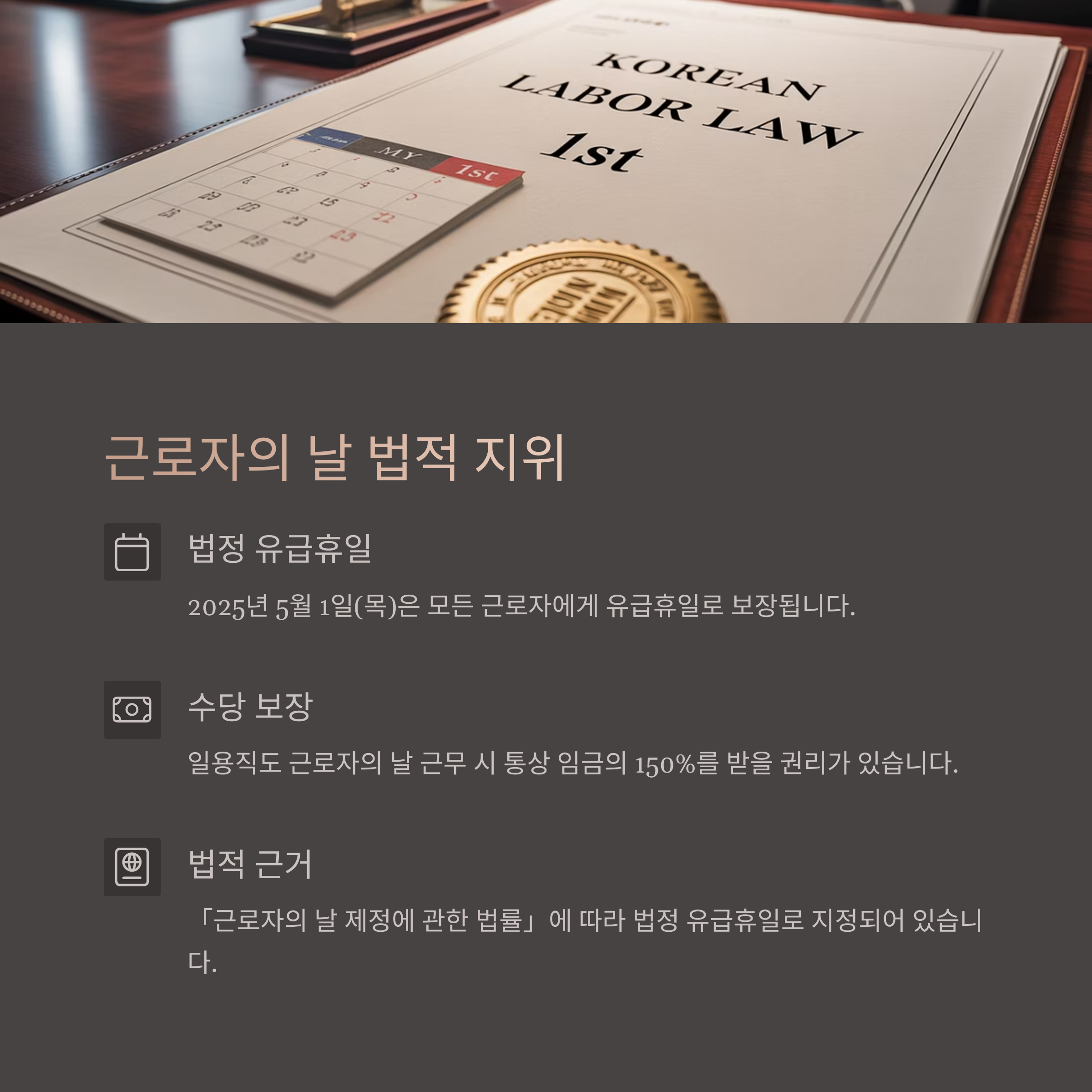 2025년 5월 1일 근로자의 날은 「근로자의 날 제정에 관한 법률」에 따라 법정 유급휴일로 지정되어 있습니다. 공휴일과는 다른 개념의 '법정 휴일'이지만, 모든 근로자에게 유급으로 적용됩니다. 일용직 근로자도 근로자의 날에 일할 경우 통상 임금의 150%를 받을 권리가 있으며, 이는 기본급(100%)과 휴일근로수당(50%)을 합한 금액입니다. 2025년에는 목요일에 해당하는 근로자의 날을, 기업은 유급휴일로 보장해야 합니다.