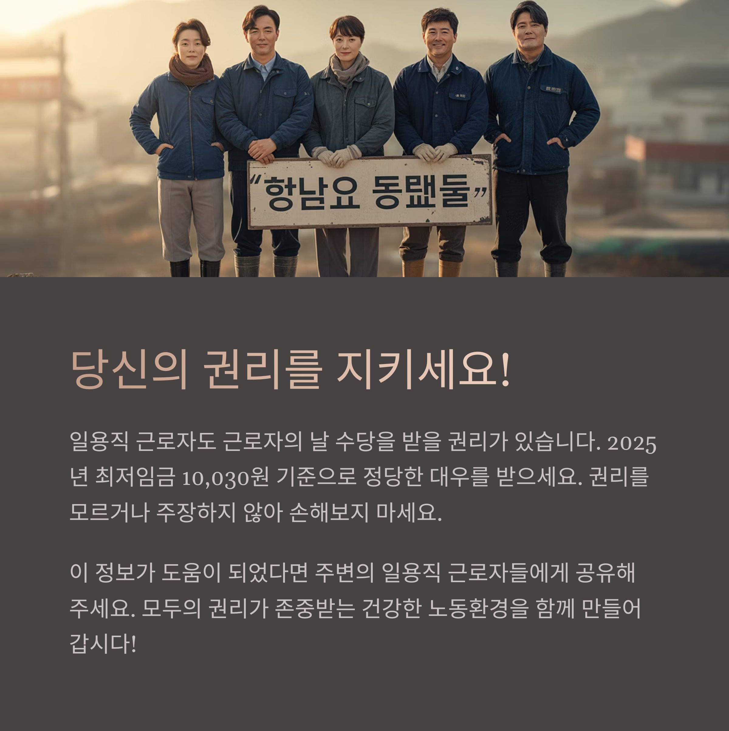 일용직 근로자도 근로자의 날에 마땅한 수당을 받을 권리가 있습니다. 하지만 많은 일용직 근로자들이 자신의 권리를 제대로 알지 못해 정당한 수당을 받지 못하는 경우가 많습니다. 특히 2025년에는 최저임금이 10,030원으로 인상되면서 일용직 근로자의 날 근무수당에 대한 정확한 이해가 더욱 중요해졌습니다. 이 글에서는 일용직 근로자가 알아야 할 근로자의 날 수당에 관한 모든 정보를 최신 법령을 바탕으로 알려드립니다.