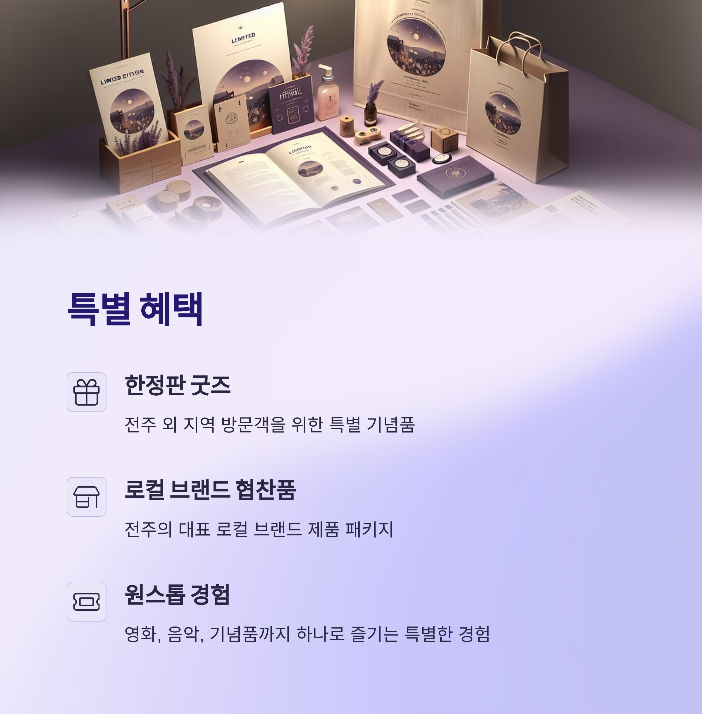 전주씨네투어X음악은 단순히 공연을 관람하는 것을 넘어, 전주를 방문한 관람객들에게 더욱 특별한 추억을 선사하기 위한 다양한 혜택을 준비했습니다. 특히 전주 외 지역에서 방문한 관광객들을 위한 매력적인 선물이 기다리고 있으니 놓치지 마세요!