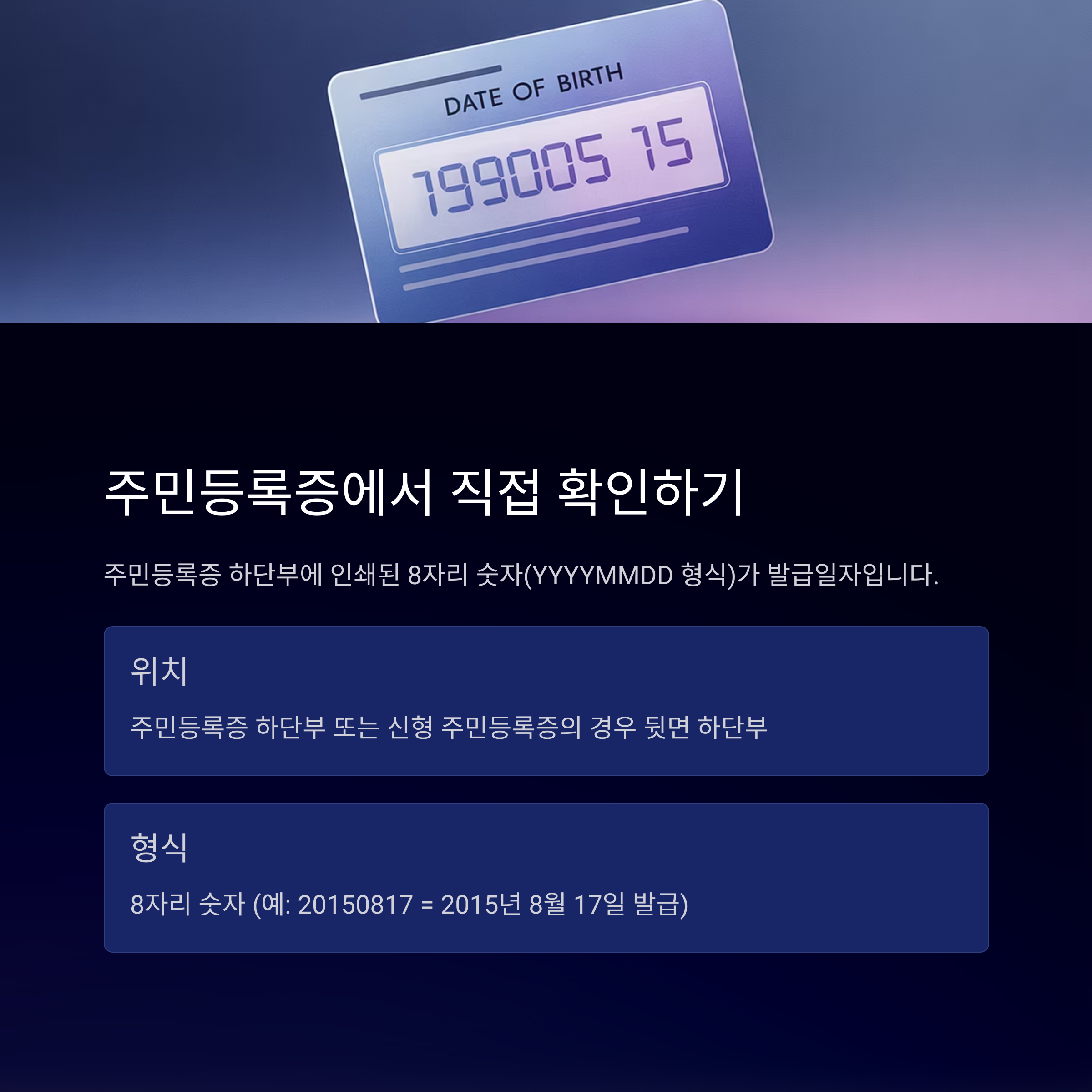 - 주민등록증 하단부에 인쇄된 8자리 숫자(YYYYMMDD 형식)