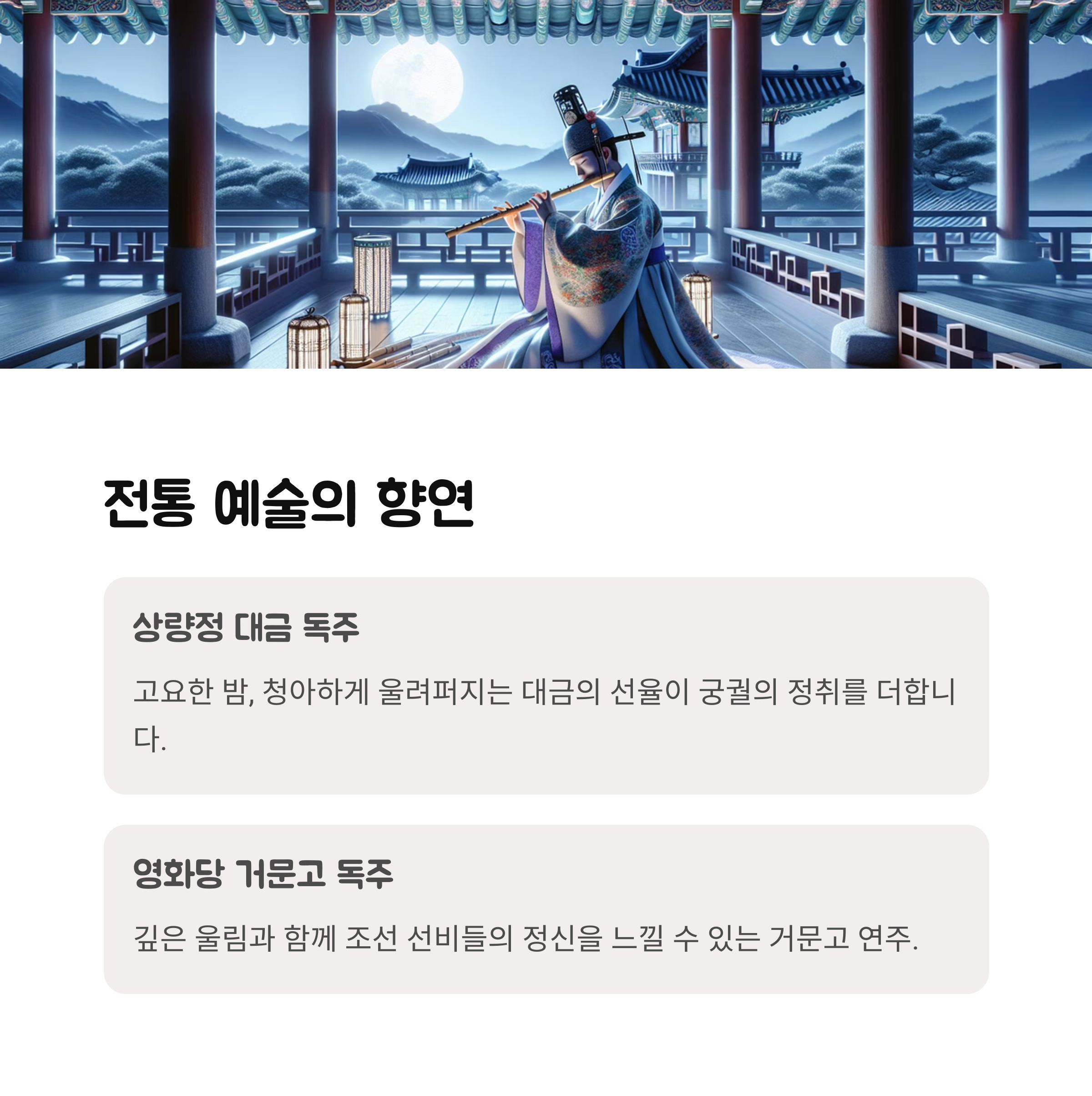창덕궁 달빛기행은 은은한 달빛 아래 조선시대 궁궐을 거닐며, 전문 해설사의 설명과 함께 전통예술공연을 관람할 수 있는 체험형 프로그램이에요. 보통은 들어가기 어려운 후원 숲길과 낙선재, 부용지, 연경당 등도 관람할 수 있어서 더욱 특별한데요.