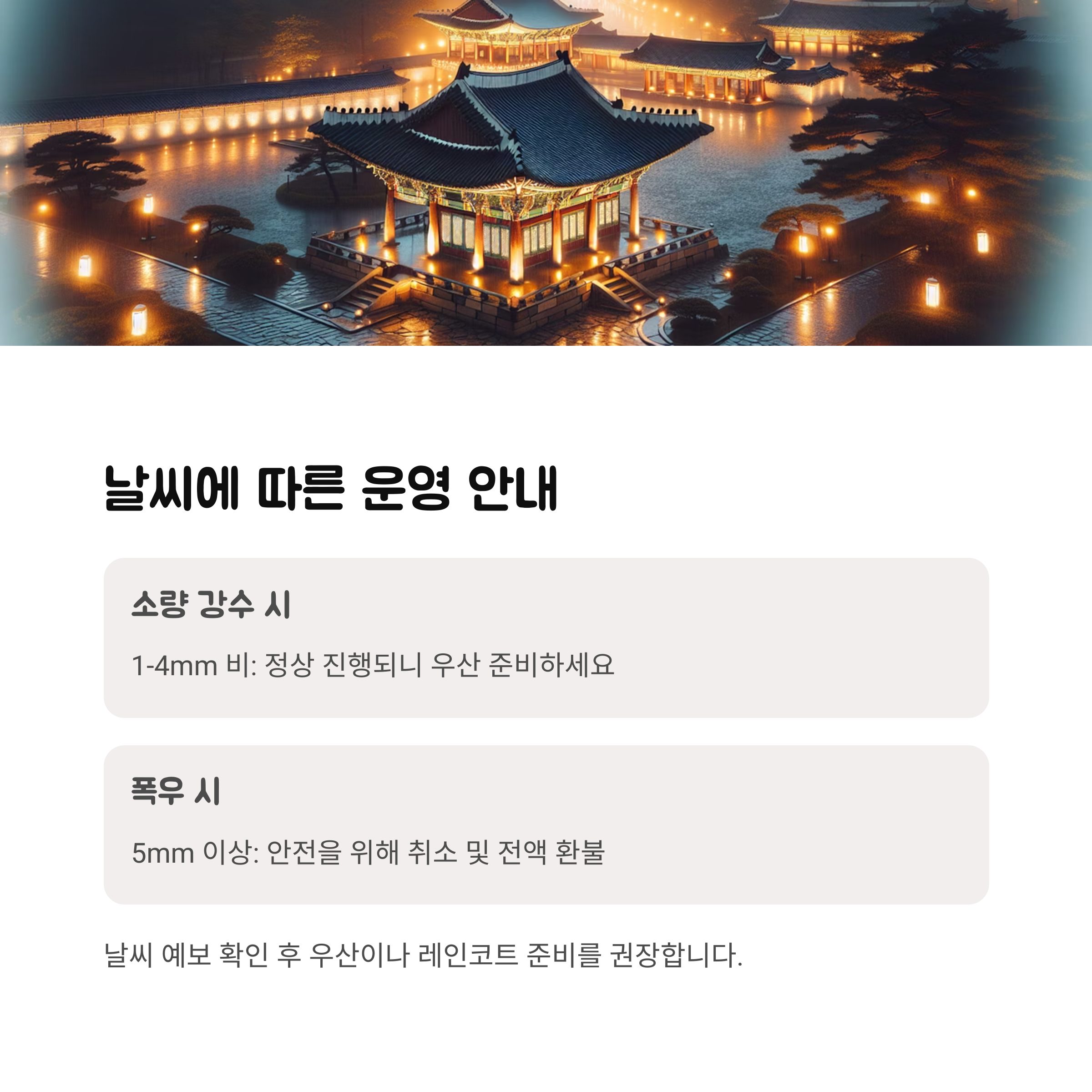 - 궁궐 내 조명이 있지만 길이 고르지 않아 안전에 유의하세요.