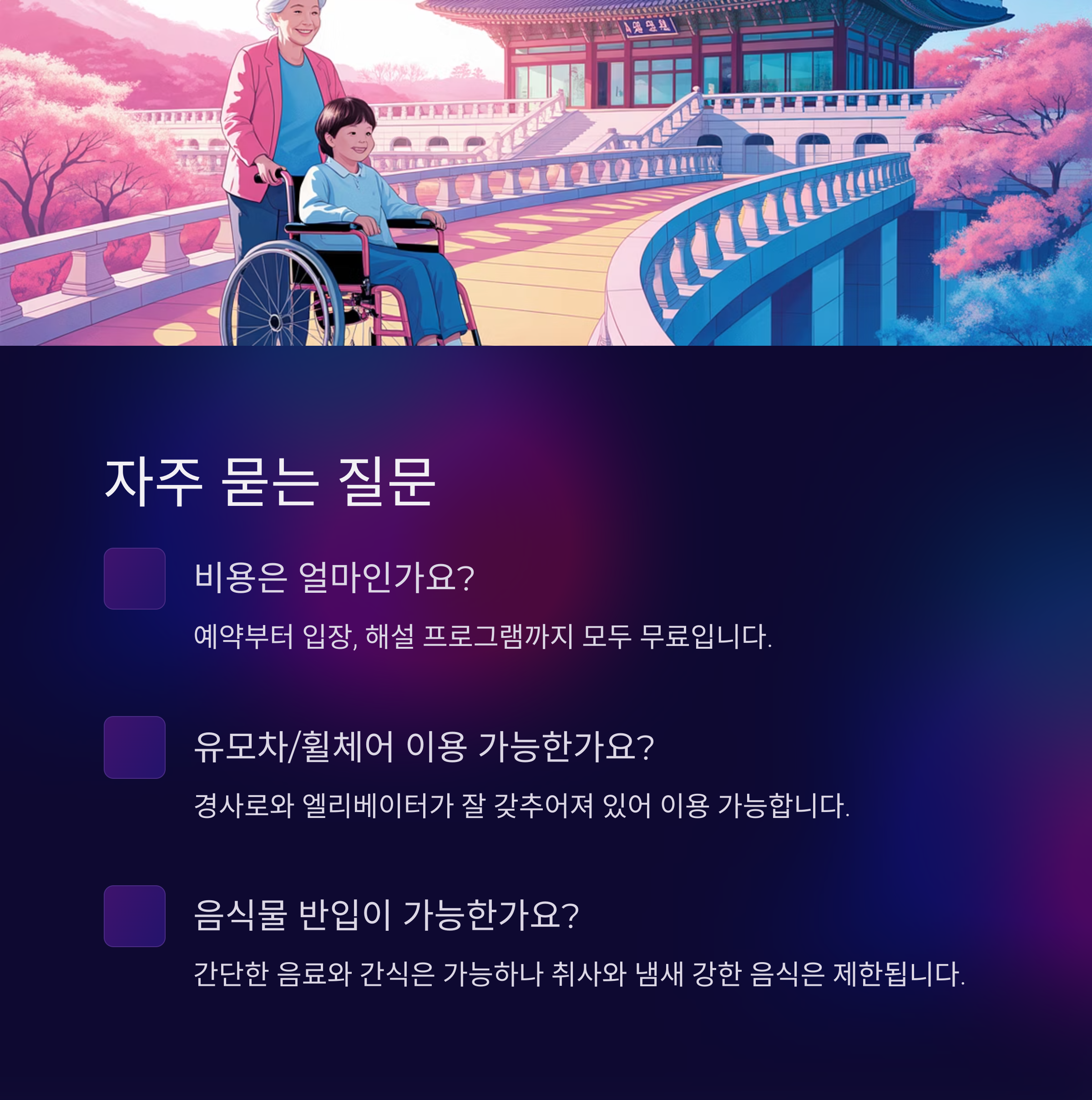 A: 네, 가능합니다. 경내에 경사로나 엘리베이터가 잘 갖추어져 있어 유모차나 휠체어 이용에 큰 불편은 없습니다. 도움이 필요하면 언제든지 주변 직원에게 문의하세요.