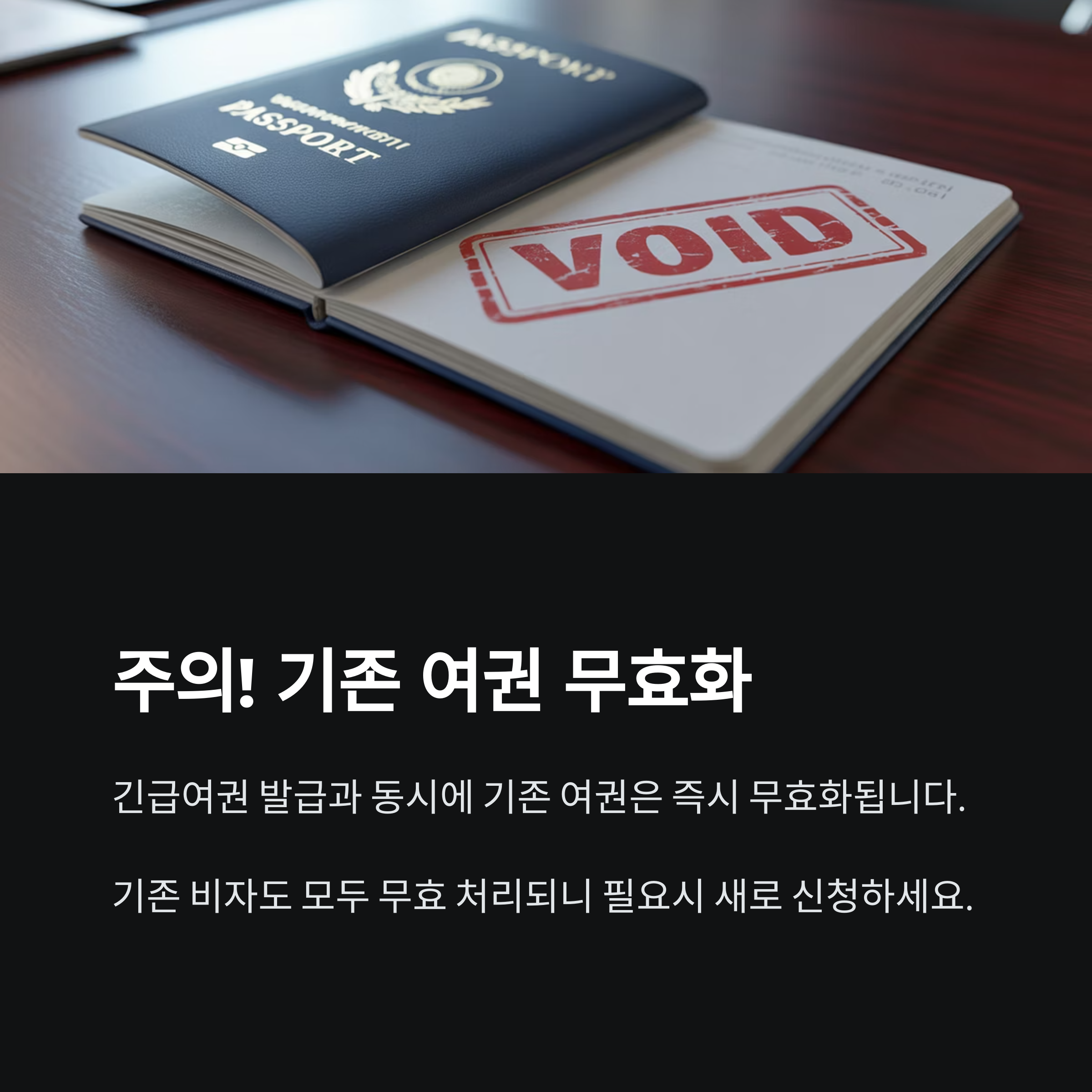 - 기존 여권 무효화 인지: 긴급여권 발급시 기존 여권과 비자는 모두 무효 처리됨