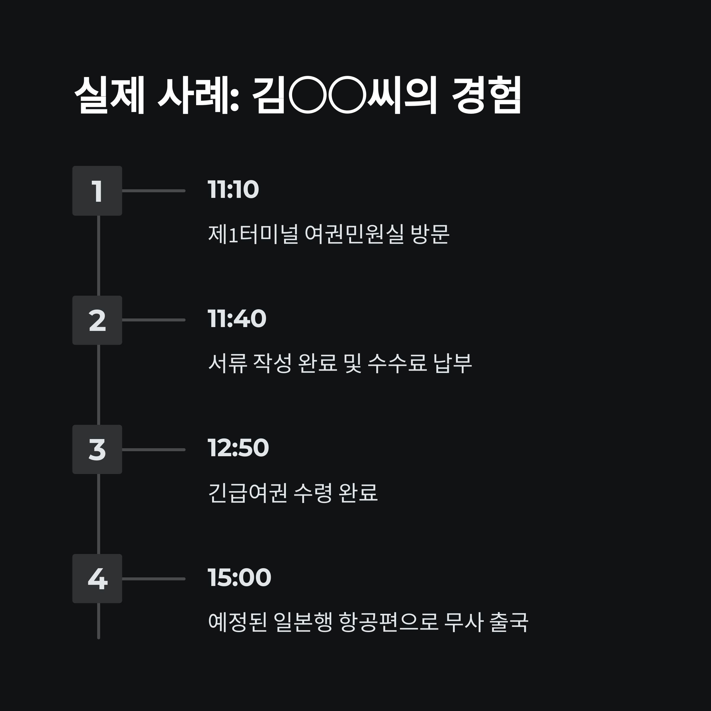 - 즉시 여권민원실 방문: 제1터미널 3층 또는 제2터미널 2층에서 긴급여권 발급 가능