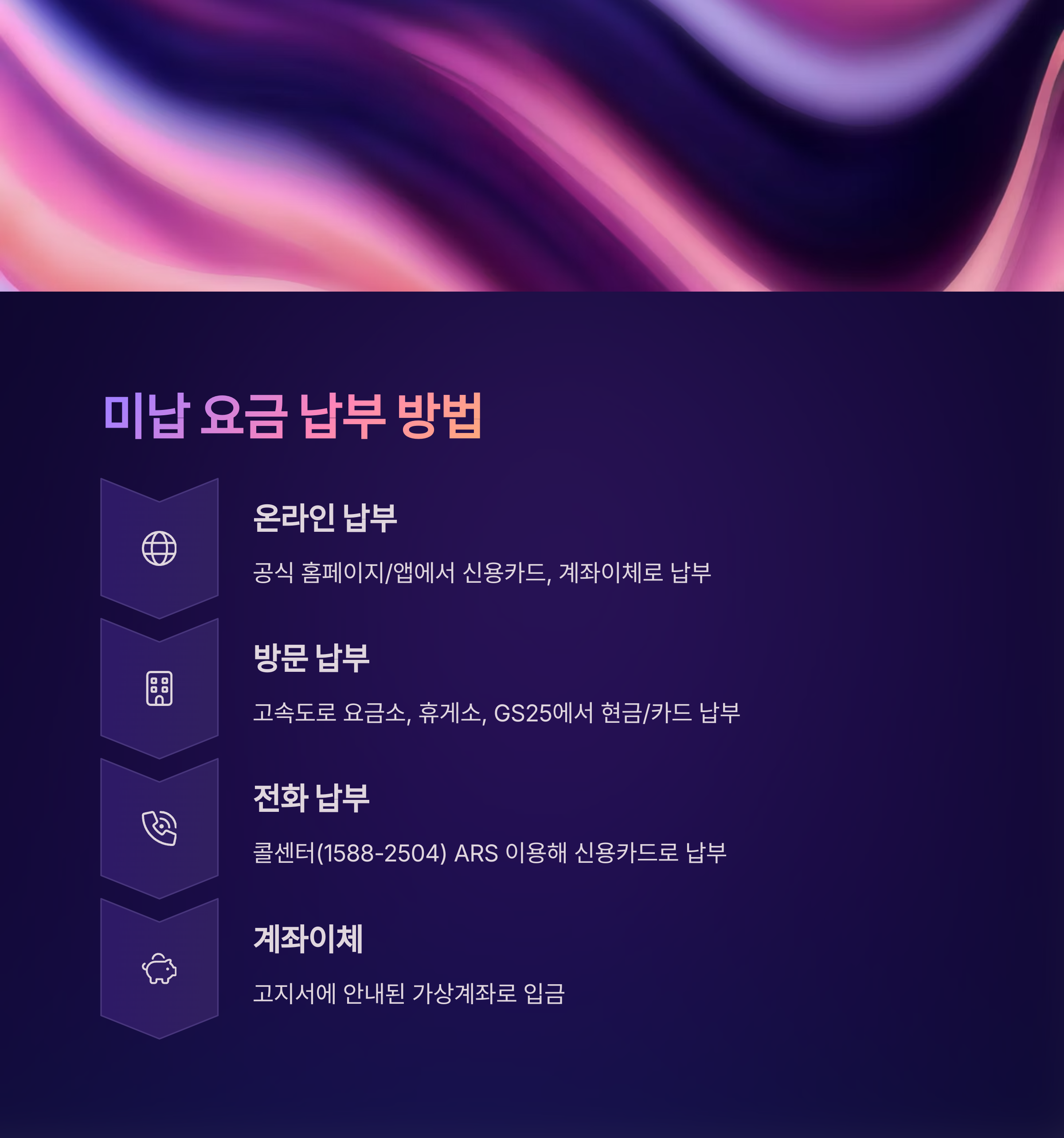 | 방문 납부 | 전국 고속도로 요금소, 휴게소, GS25 편의점 등 | 현금, 신용/체크카드 |