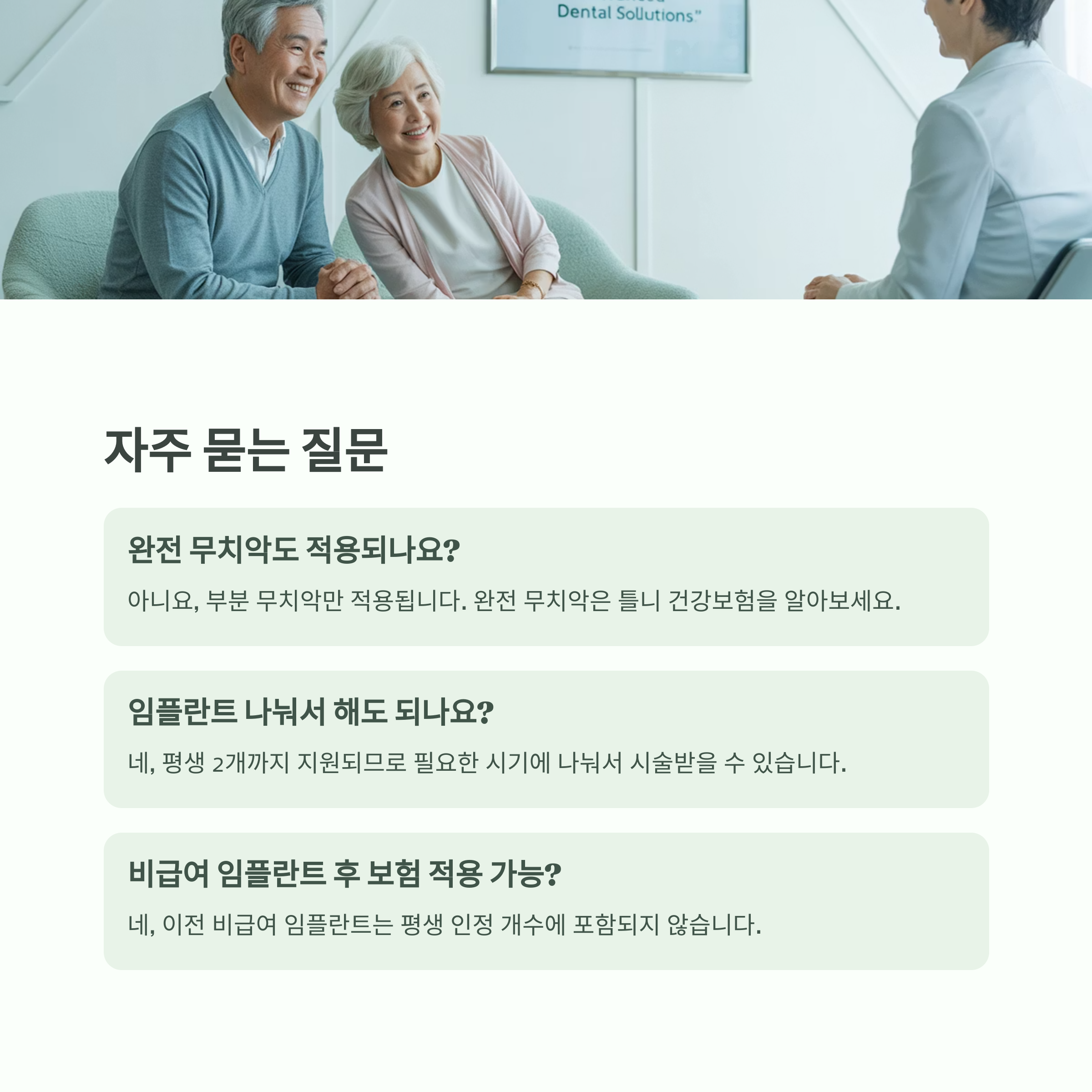 - 사후 관리: 임플란트 보철물 장착 후 3개월까지는 진찰료만 부담하며 사후 관리를 받을 수 있습니다.