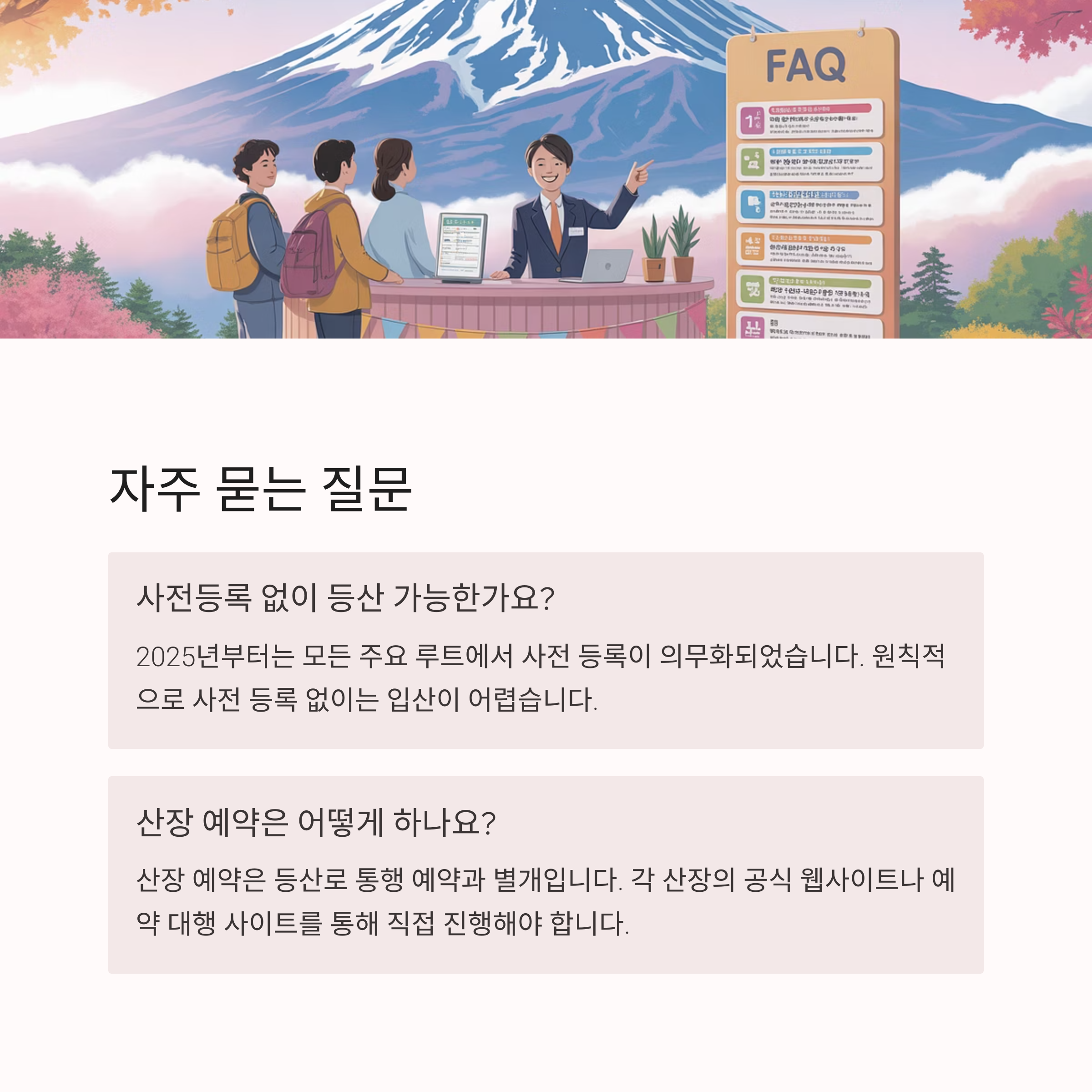 - 사전등록 필수: 모든 주요 루트(요시다, 후지노미야, 스바시리, 고텐바)는 사전 등록 및 입산증 발급이 의무입니다.