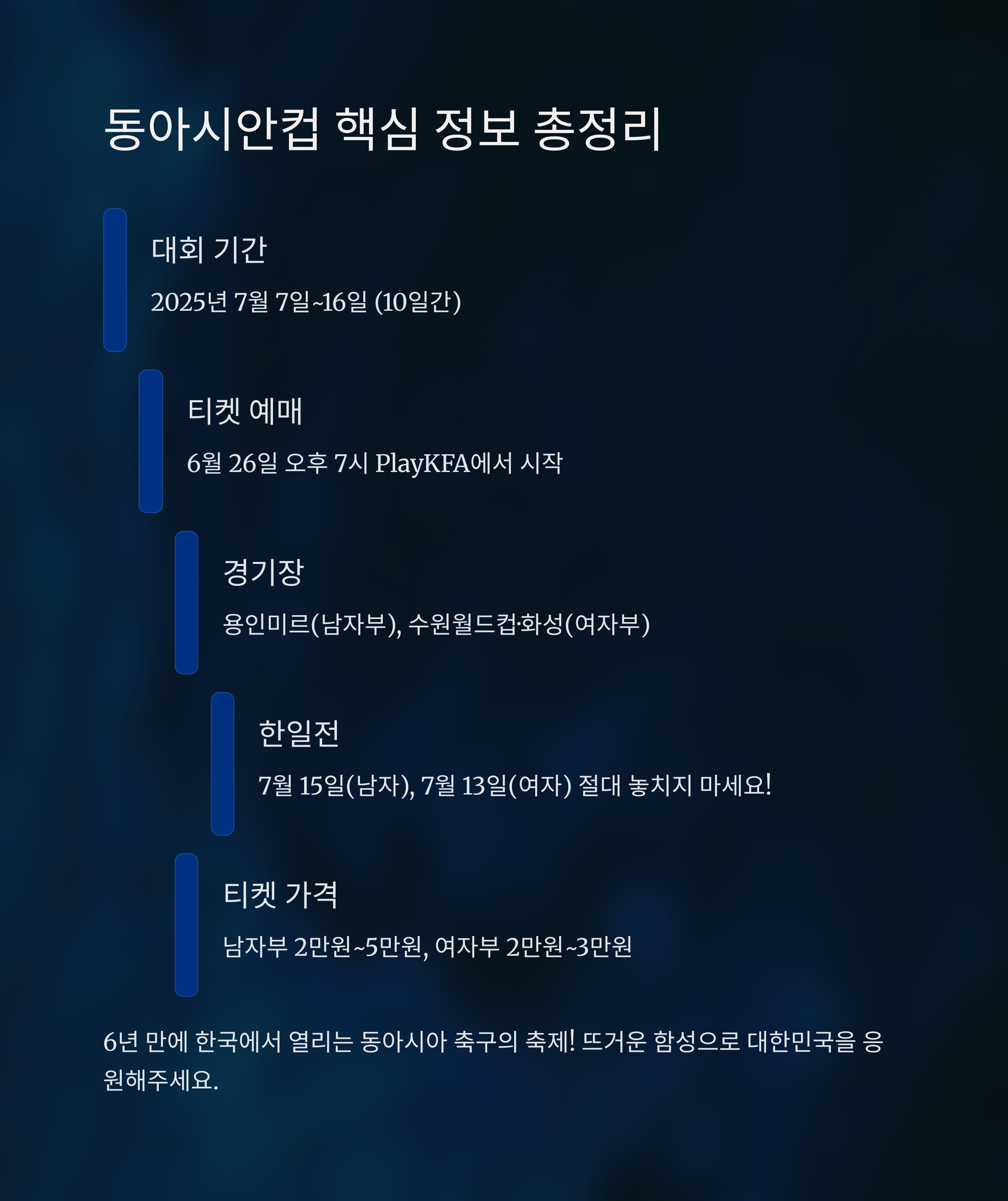 6년 만에 한국에서 열리는 동아시아 축구의 축제, 놓치지 마시고 경기장에서 뜨거운 함성으로 대한민국을 응원해주세요. 개인의 일정과 교통편을 미리 확인하시고, 안전하고 즐거운 관람 되시길 바랍니다.