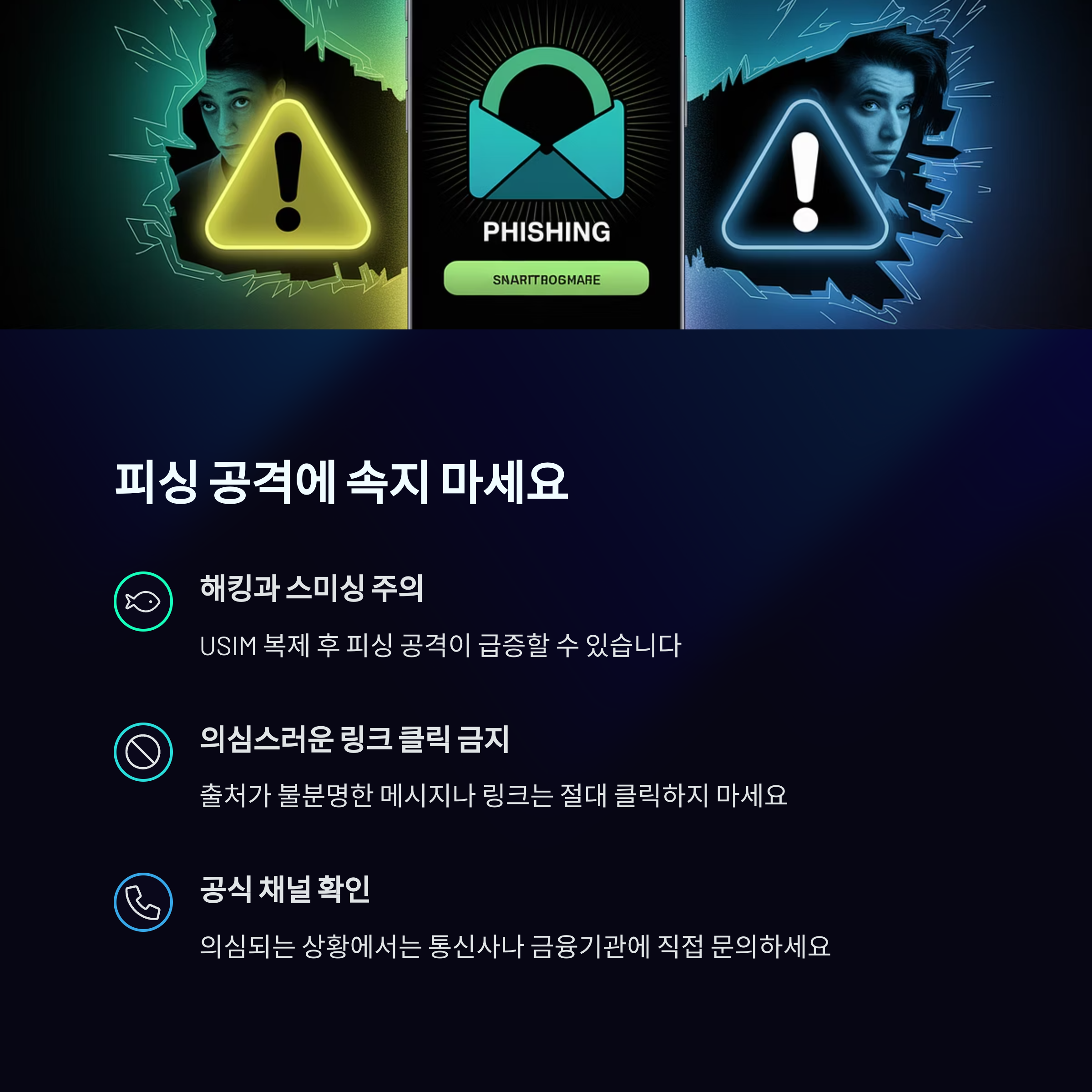 USIM 정보 유출 사고 이후에는 SMS, 이메일, 전화 등을 통한 피싱 시도가 증가할 가능성이 높습니다. 공격자들은 대중의 불안감을 이용하여 개인 정보를 탈취하려 할 것입니다.